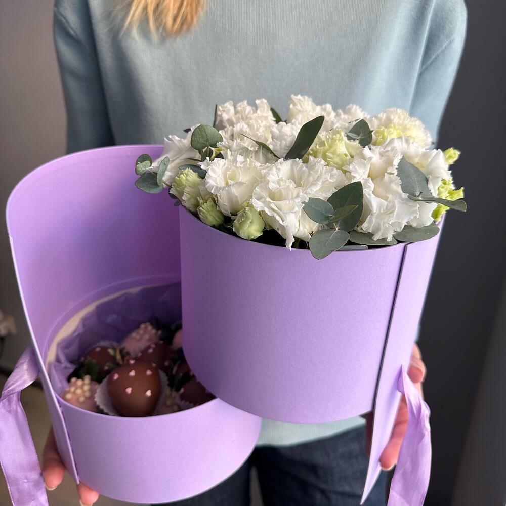 Эустома – 5 шт.Голубика – 20 шт.Эвкалипт Baby Blue – 1 шт.Клубника в шоколаде callebaut (бельгия) – 15 шт.