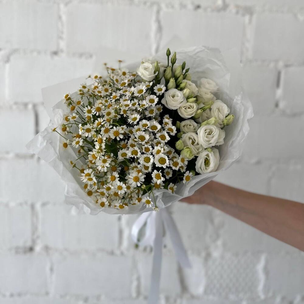 Ароматный букет из ромашек, сантини и стойкой эустомы