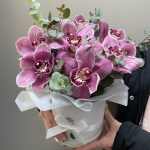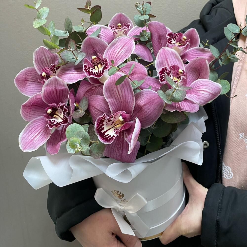 Орхидея Цимбидиум – 7 шт.Эвкалипт – 2 шт.Коробка шляпная – 1 шт.Оазис флористический – 1 шт.