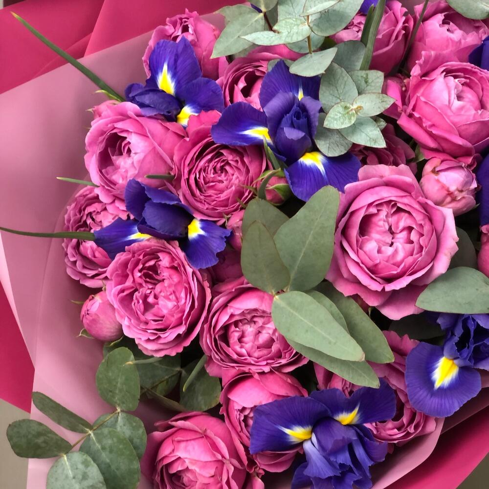 Авторский букет с ирисами и пионовидными розами