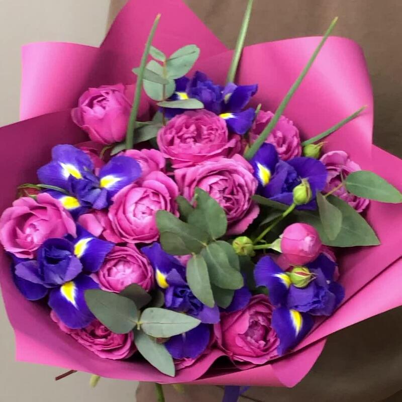 Зелень – 4 шт.Ирис синий – 6 шт.розы пионовидные кустовые – 5 шт.оформление корейская пленка – 1 шт.