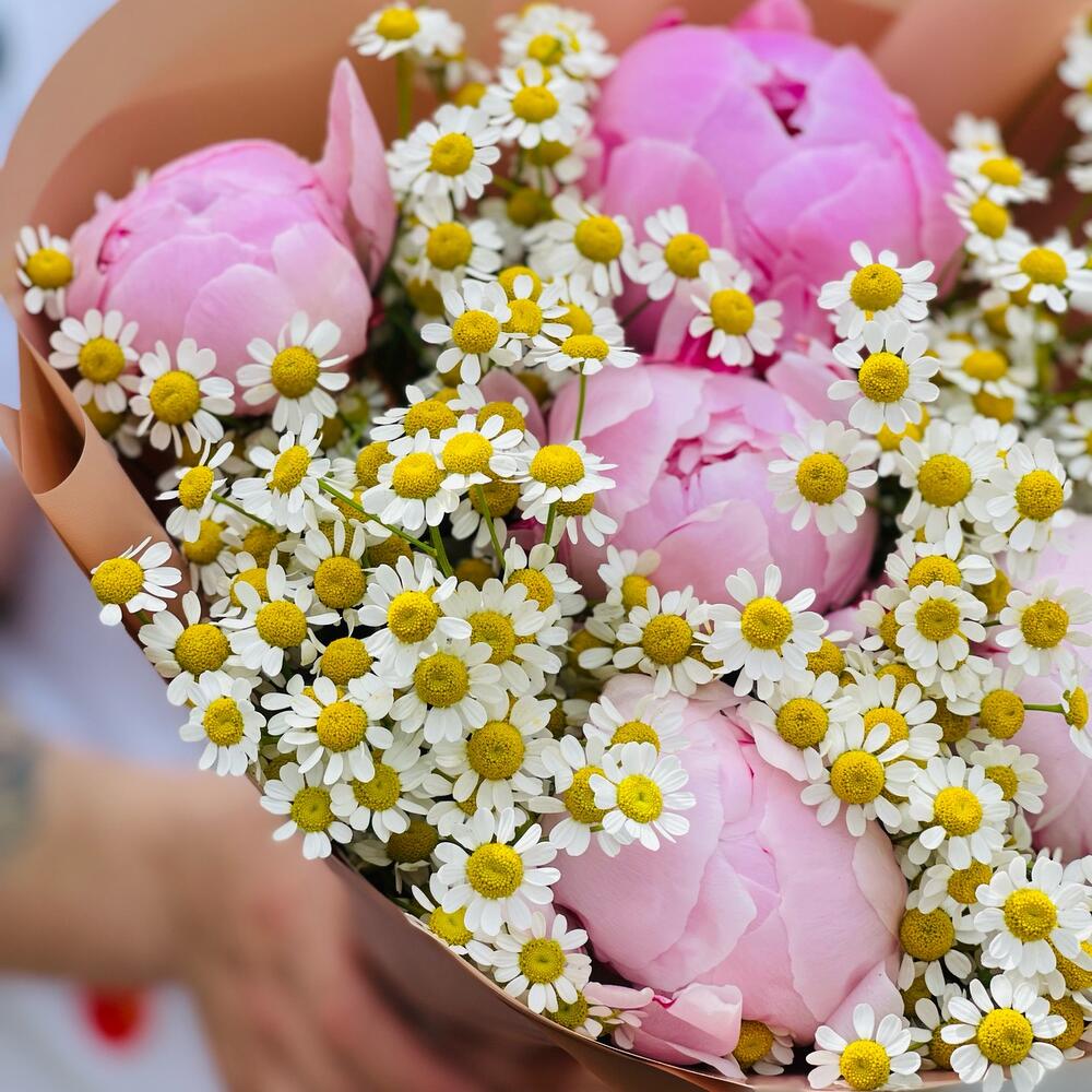 Лента атласная – 1 шт.Ромашка кустовая – 6 шт.Пион Сара Бернар – 5 шт.Упаковка дизайнерская – 3 шт.