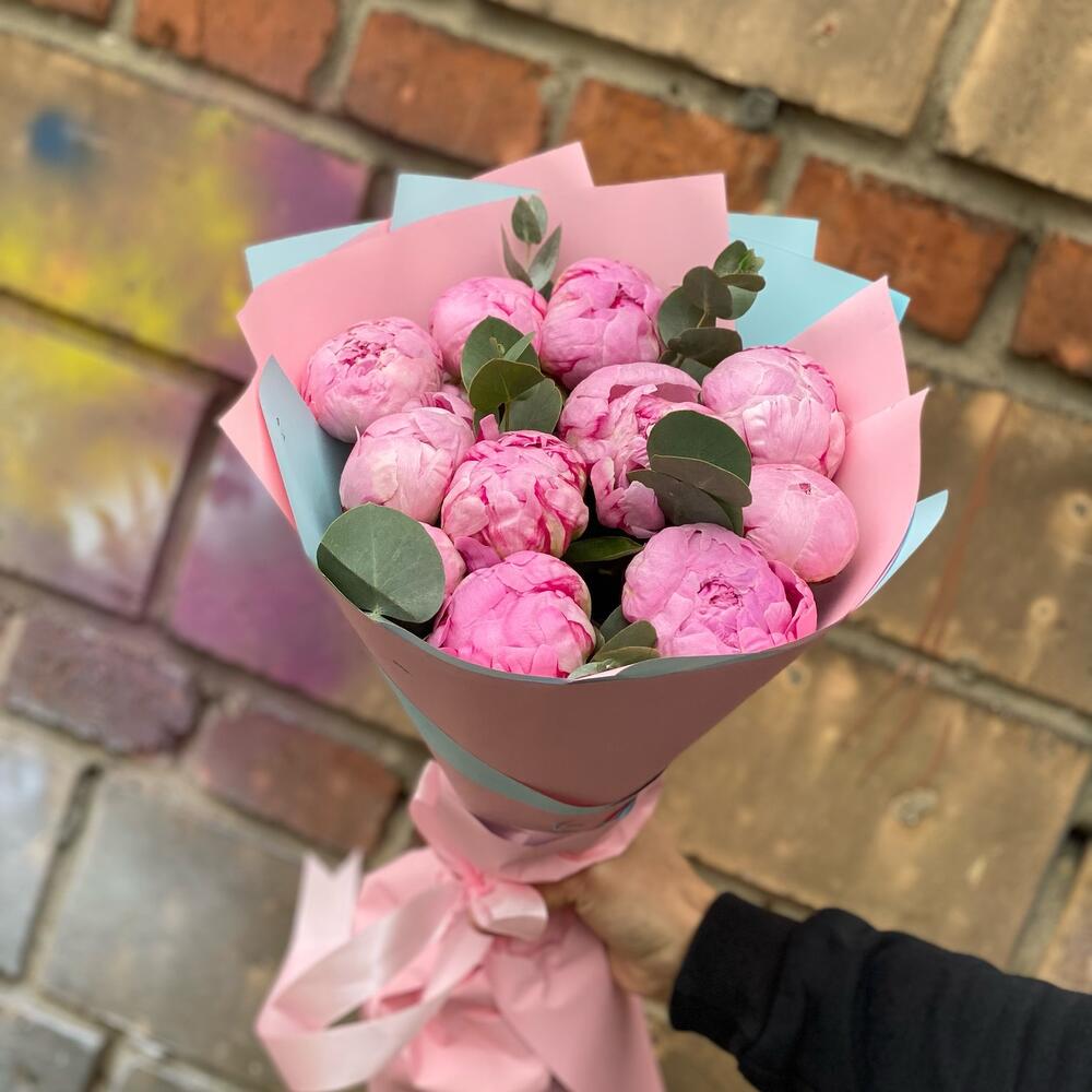Букет из 11 пионов с эвкалиптом
