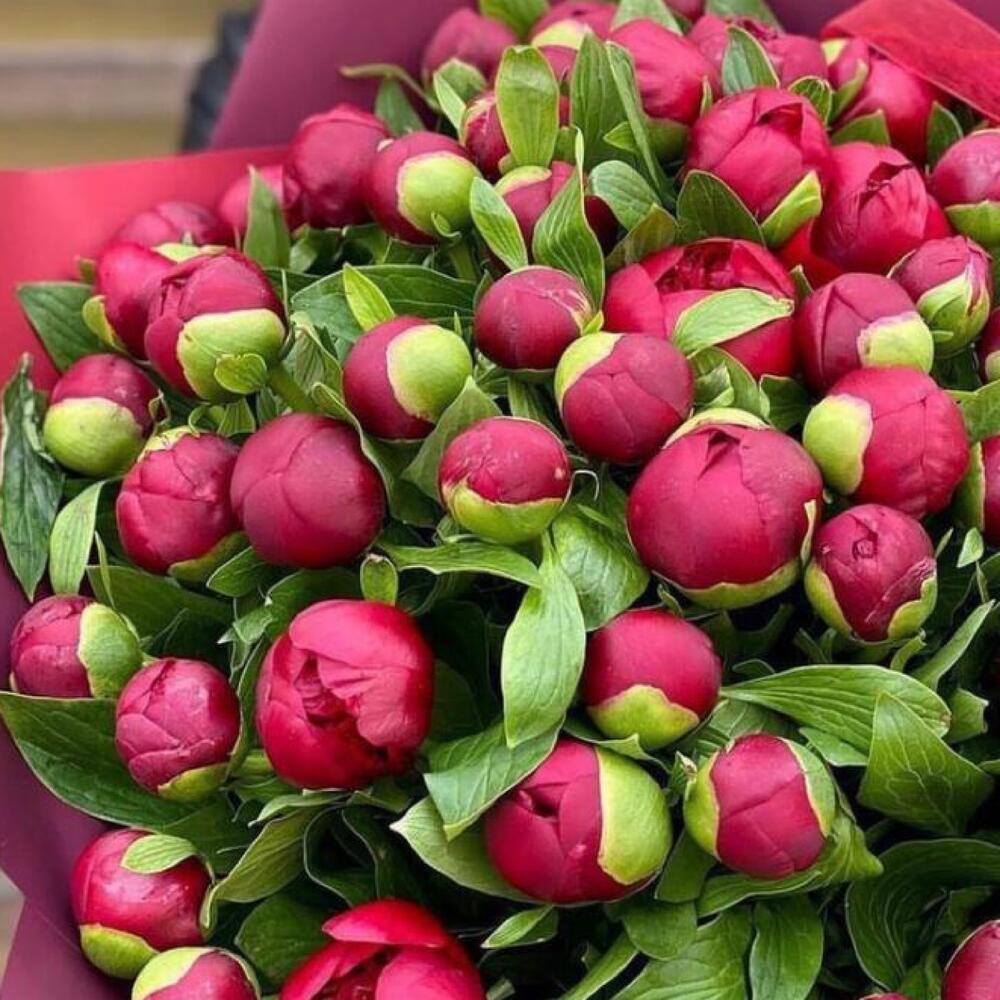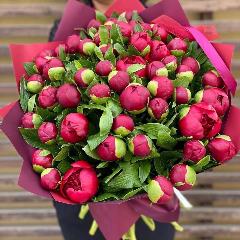 Пион бордовый – 51 шт.Упаковка дизайнерская – 2 шт.Лента атласная – 2 шт.Открыточка с вашими пожеланиями – 1 шт.хорошее настроение – 100 шт.инструкция по уходу за цветами – 1 шт.коробка переноска – 1 шт.Кризал – 1 шт.
