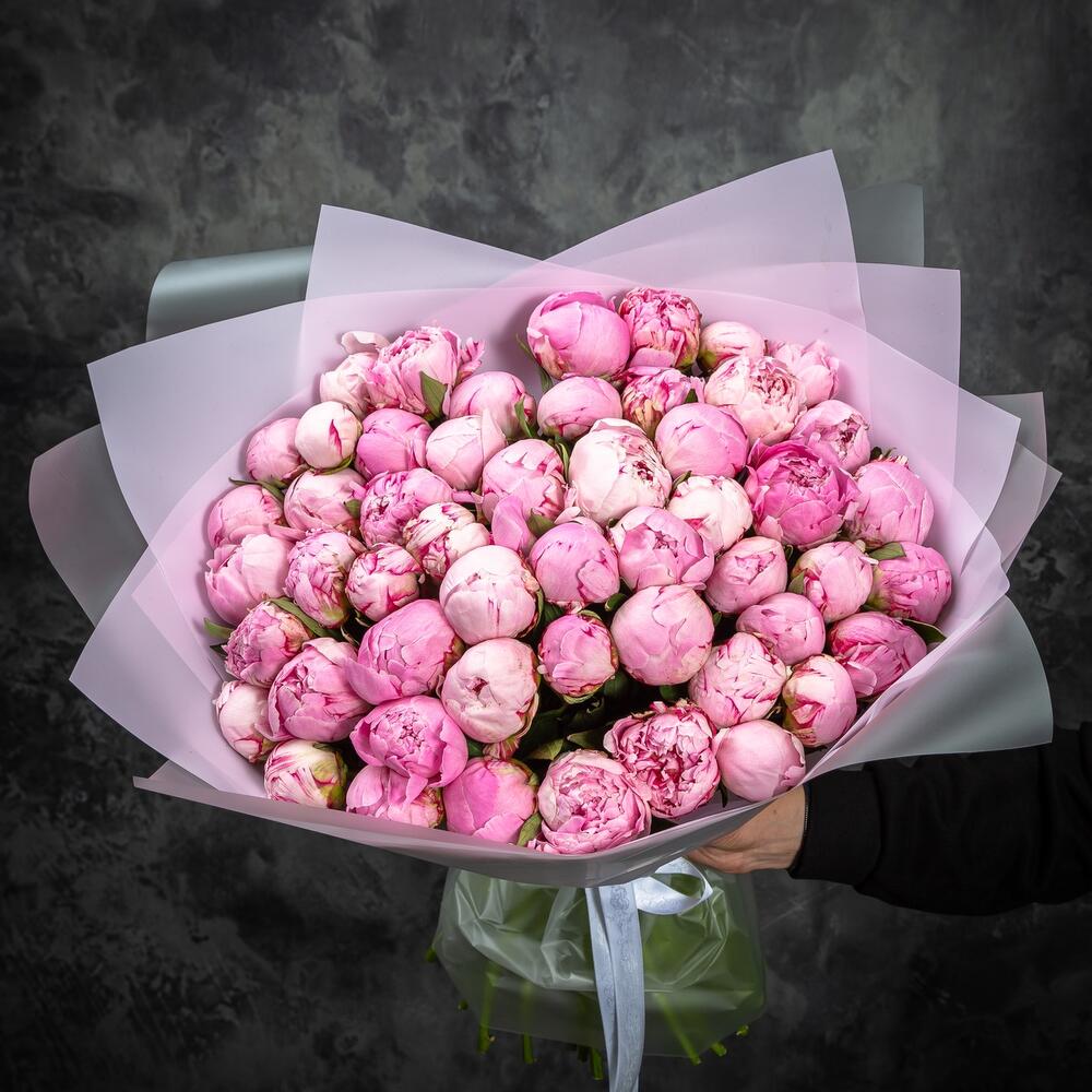 пионы розовые премиум – 51 шт.Лента атласная – 3 шт.Упаковка дизайнерская – 3 шт.Открыточка с вашими пожеланиями – 1 шт.хорошее настроение – 100 шт.коробка переноска – 1 шт.