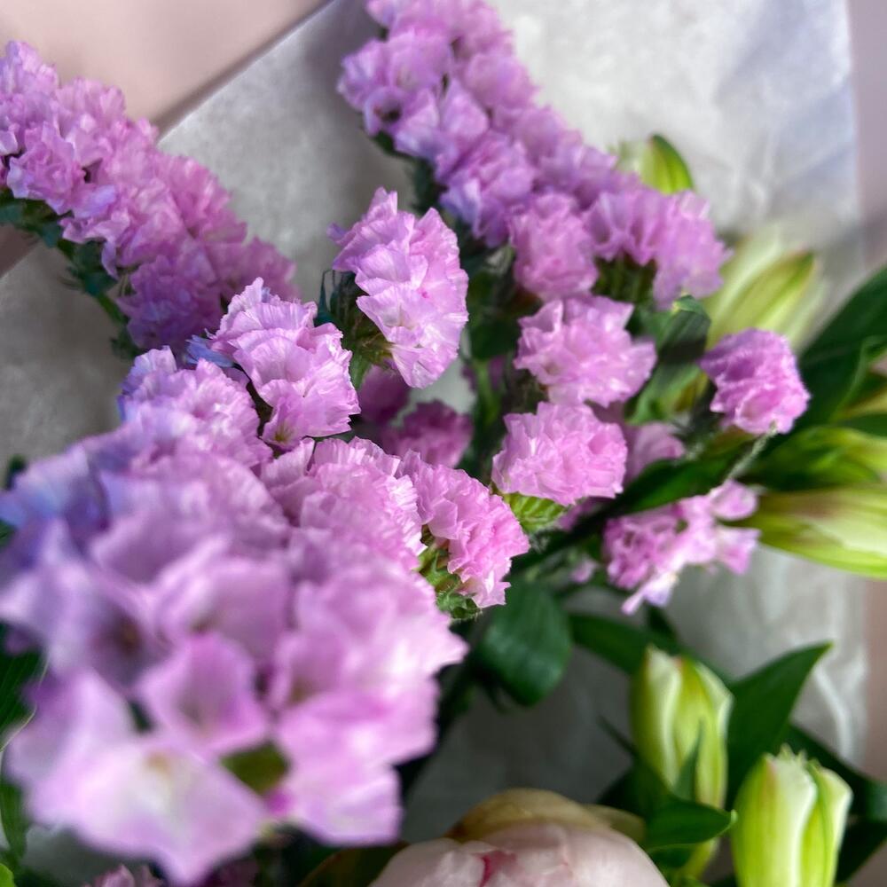 «Лавандовое созвездие» Букет из розы, гвоздики, статица и хлопка