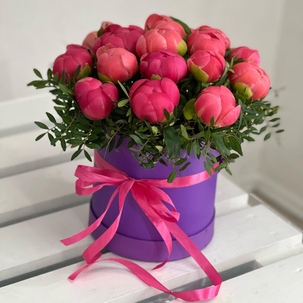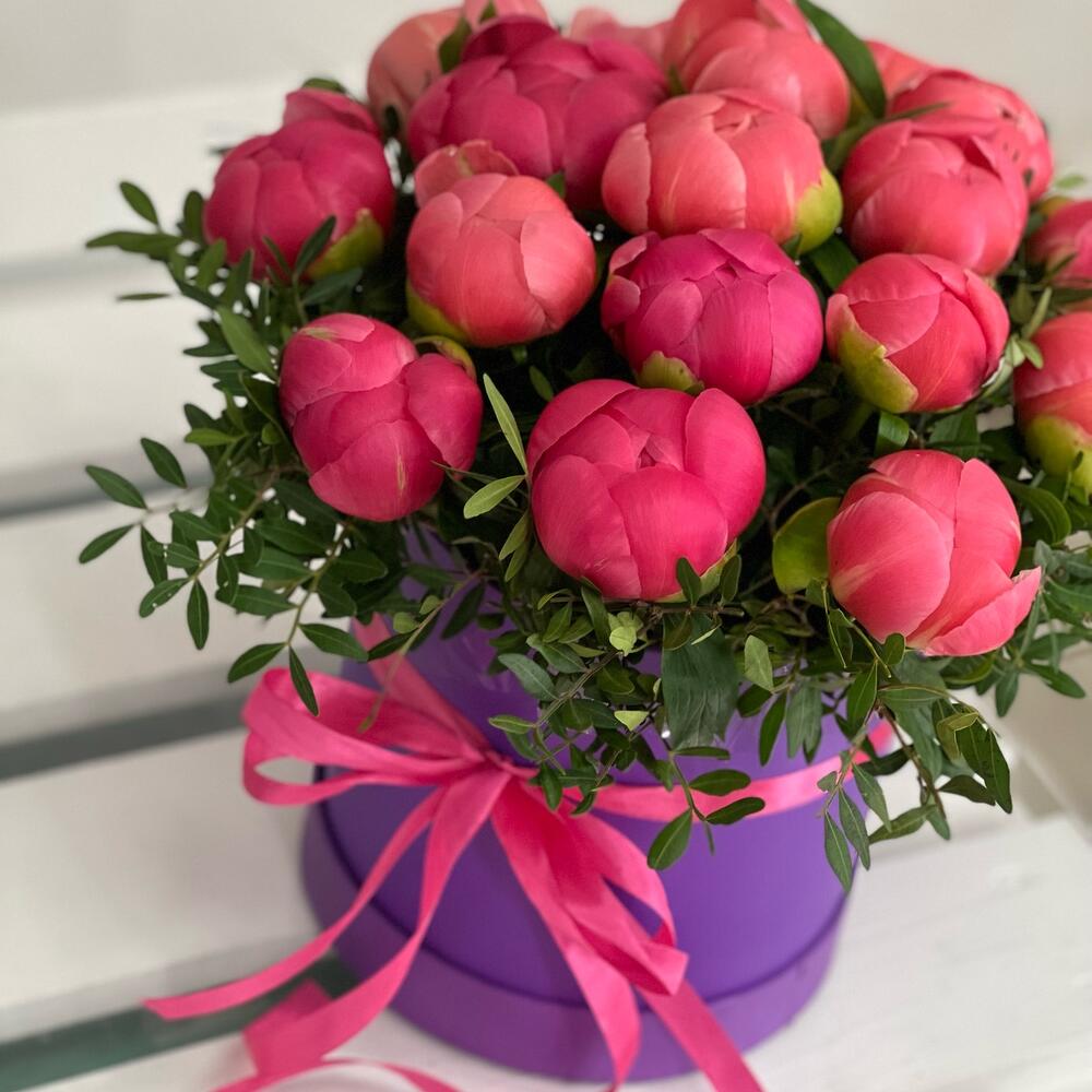 Пион Коралл Шарм (Coral Charm) – 17 шт.Фисташка – 7 шт.шляпная коробка с лентами и оазисом – 1 шт.