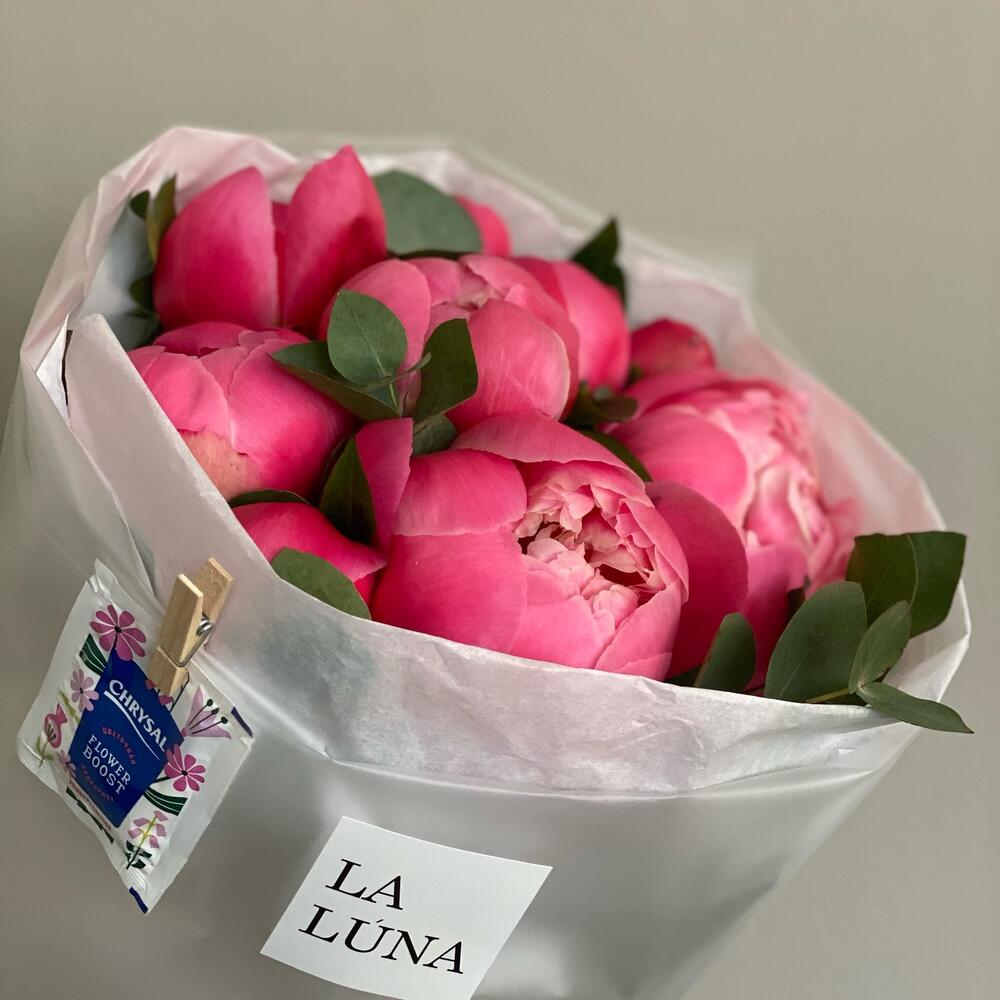 Монобукет из пионов корал шарм с эвкалиптом / 1370 id