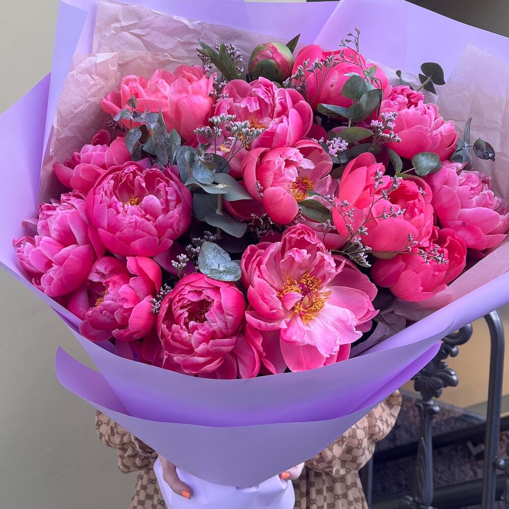 Эвкалипт – 7 шт.Лента атласная – 2 шт.Лимониум сиреневый – 4 шт.пион коралл шарм премиум – 15 шт.упаковка корейская пленка лавандовая – 1 шт.тишью крафтовое – 2 шт.