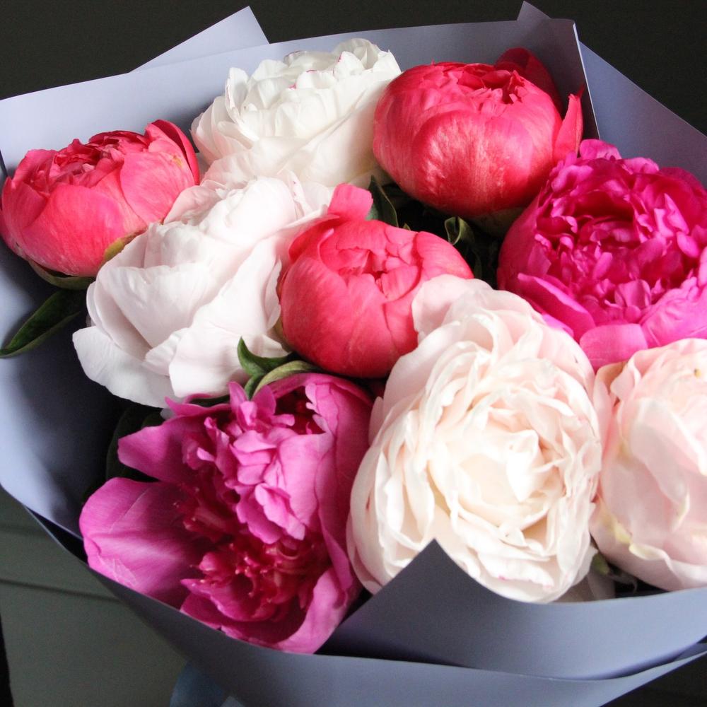 Моно букет из коралловых, белых и розовых пионов в лаконичной упаковке.Стильное цветочное решение для любого случая.