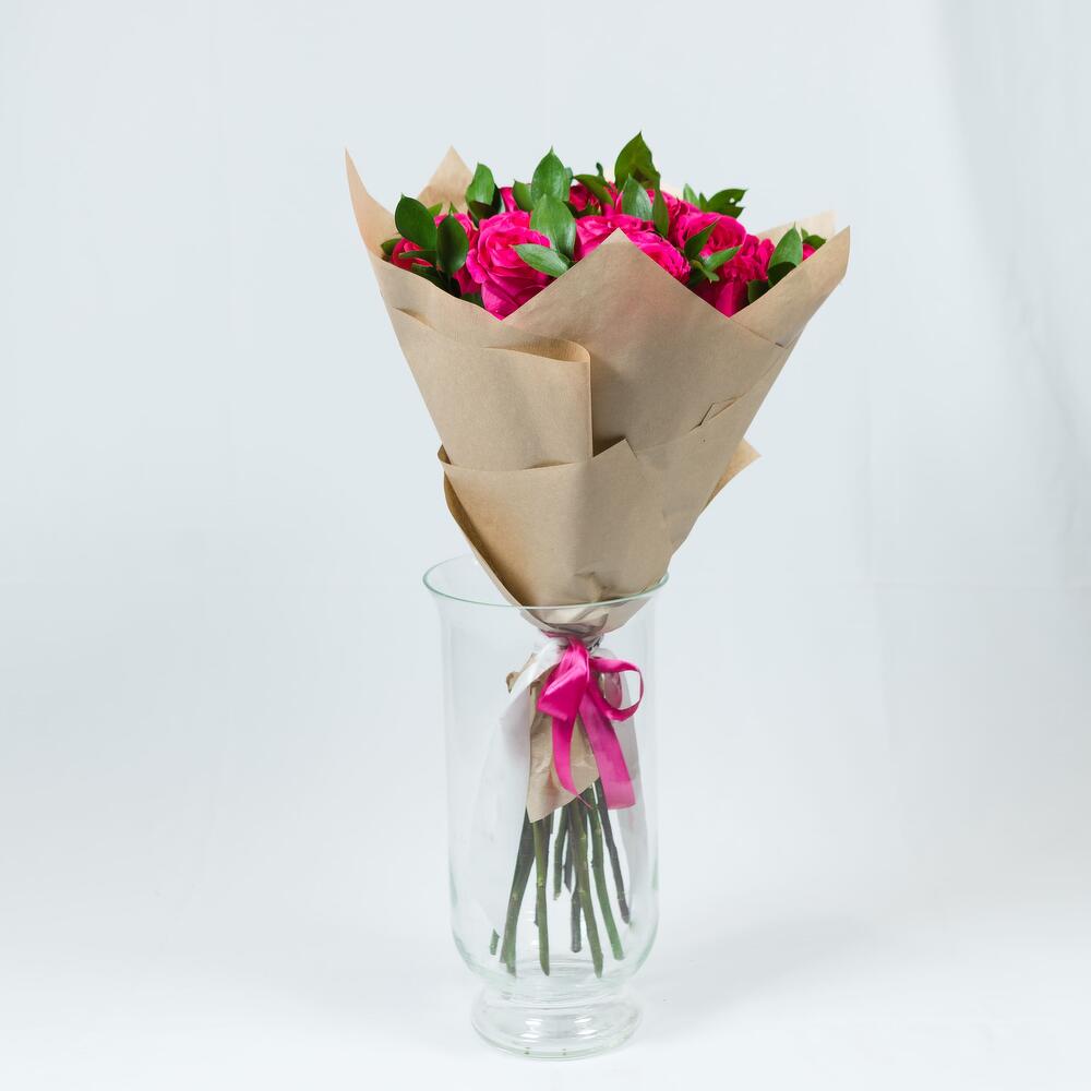 15 розовых роз 60 см с зеленью в упаковке CRAFT PREMIUМ