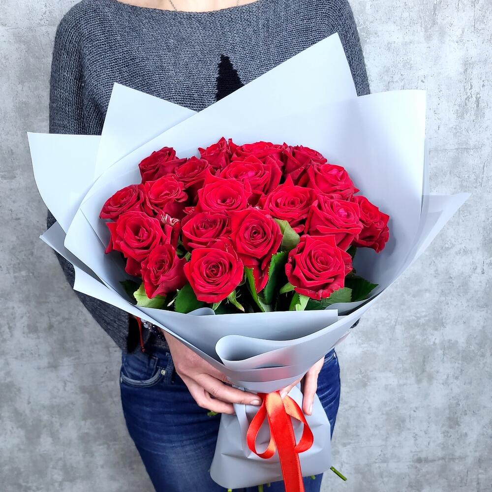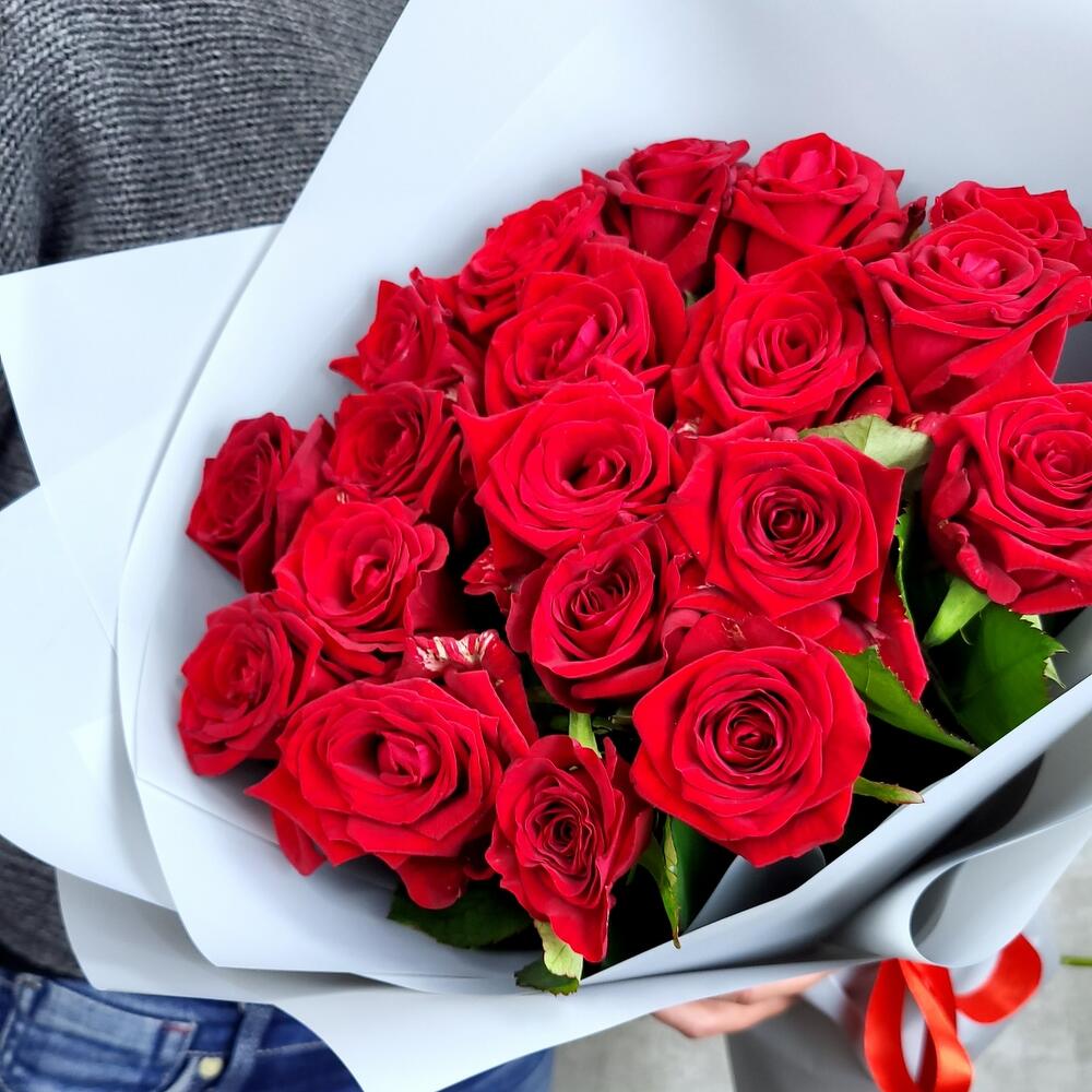 Роза – 19 шт.Лента атласная – 1 шт.Пленка матовая – 1 шт.