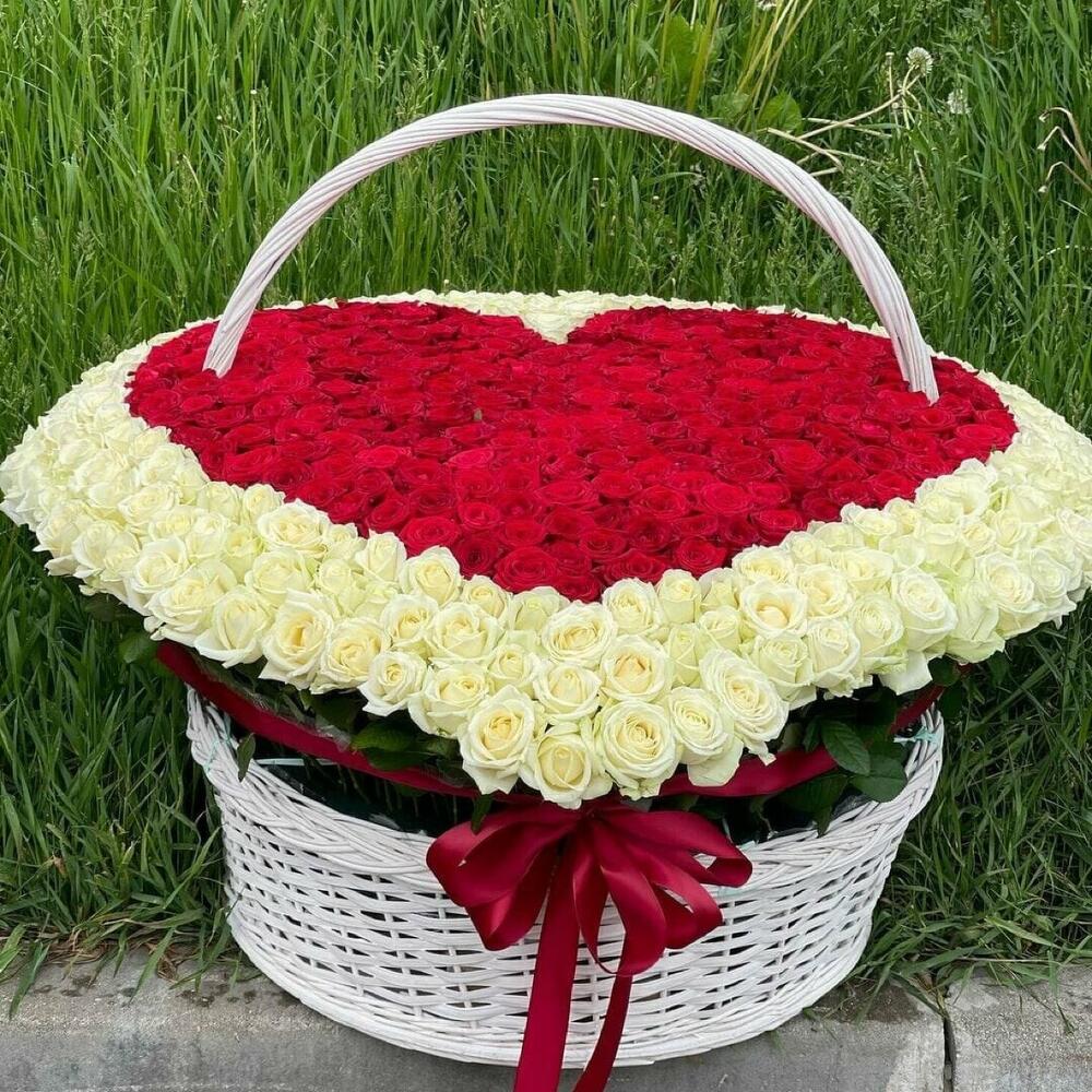 розы эквадор – 301 шт.Корзина плетеная – 1 шт.Оазис флористический – 10 шт.Лента атласная – 1 шт.