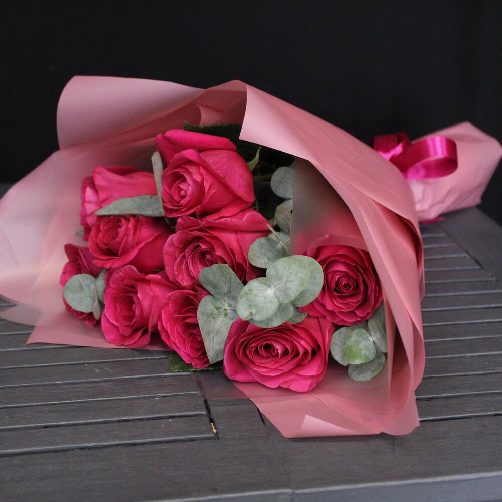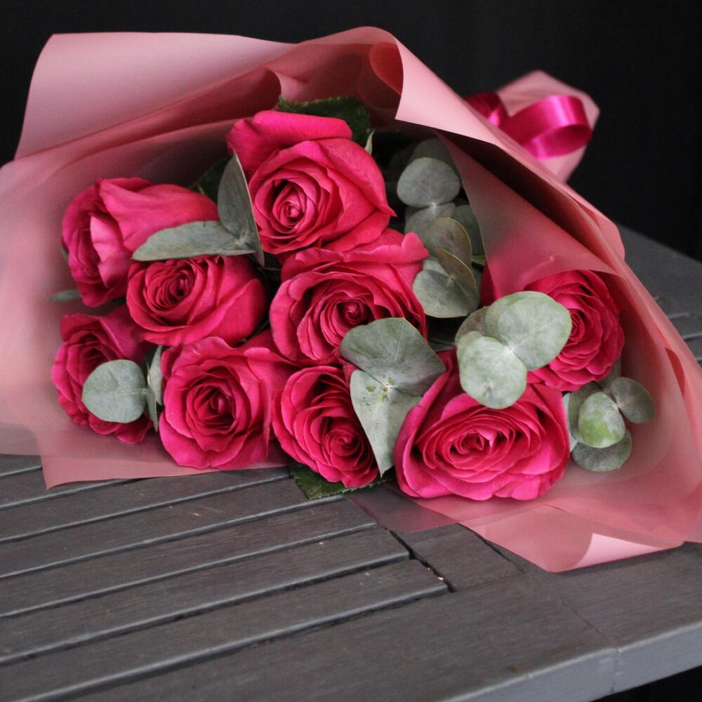 9 роз сорта pink floyd с эвкалиптом