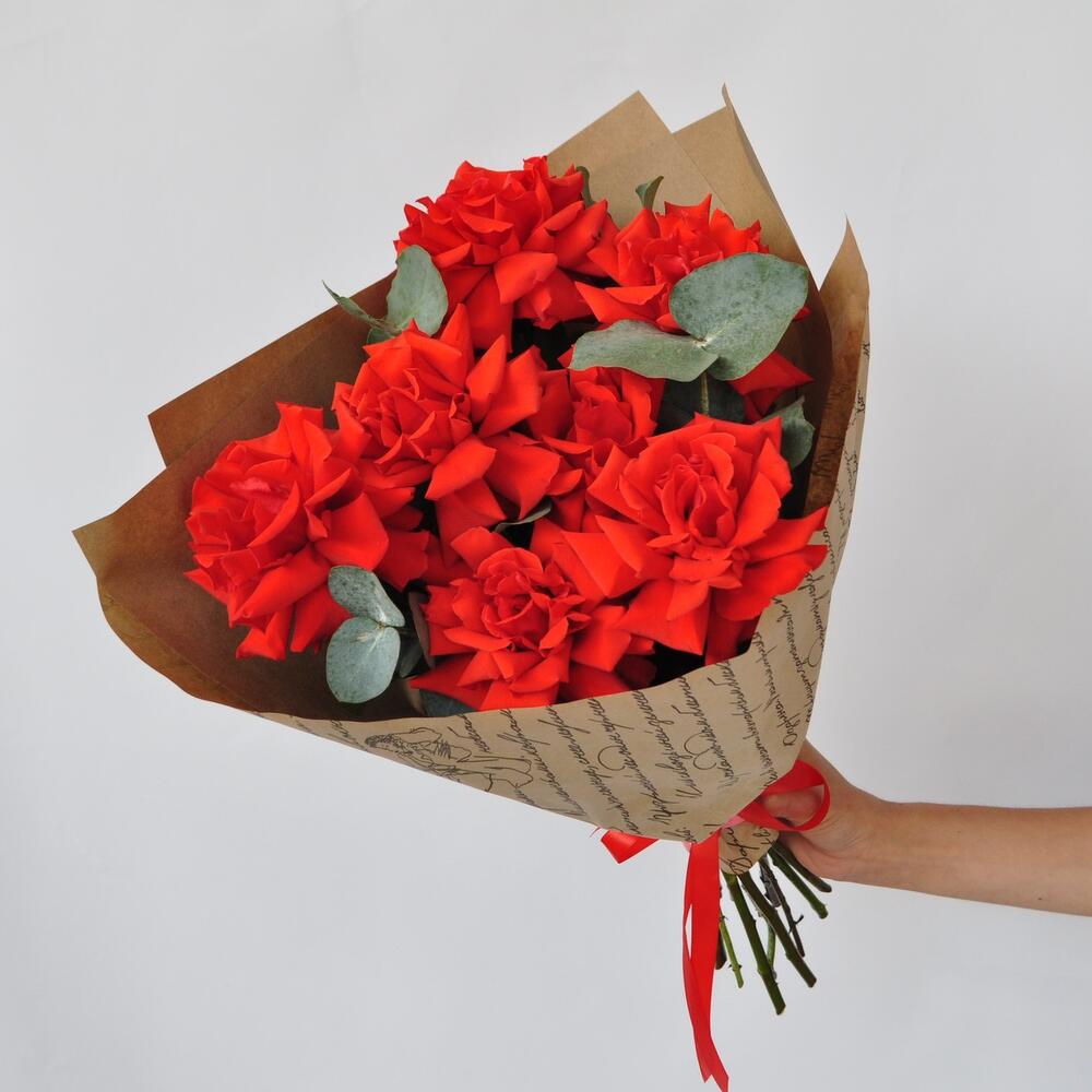 Эвкалипт – 1 шт.Лента атласная – 1 шт.Крафт – 3 шт.Роза французская – 7 шт.