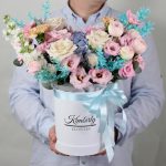 Эвкалипт – 8 шт.Гвоздика – 2 шт.Лента атласная – 1 шт.Коробка шляпная – 1 шт.Гортензия голубая – 1 шт.эустома розовая – 3 шт.Маттиола белая – 2 шт.Роза одноголовая мента – 3 шт.Губка флористическая – 1 шт.рускус стабилизированный – 4 шт.роза кустовая пионовидная мэнсфилд – 1 шт.