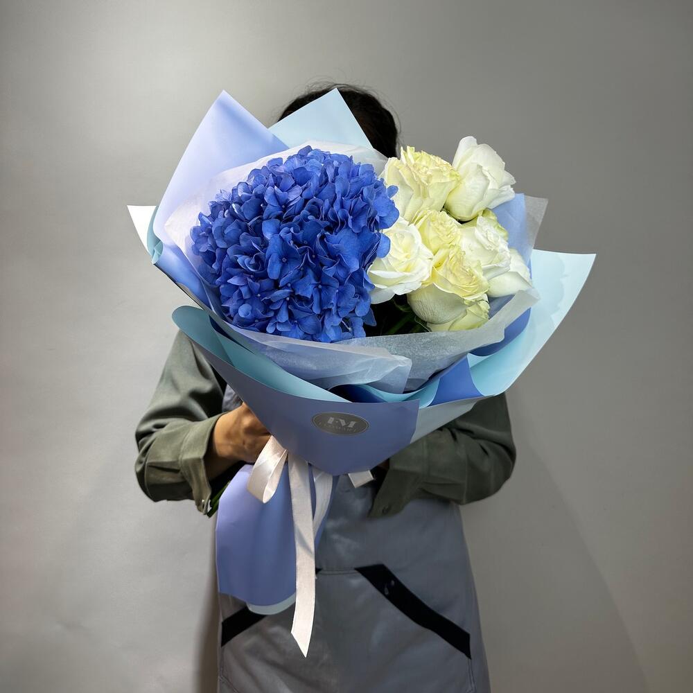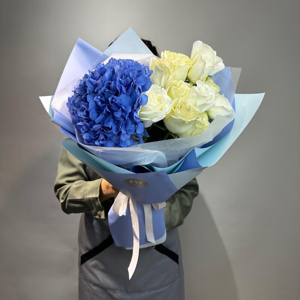 Незабываемый букет из королевской гортензий и 11 белых роз для ценителей стиля и красоты