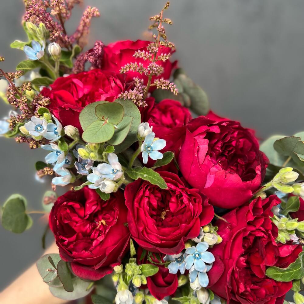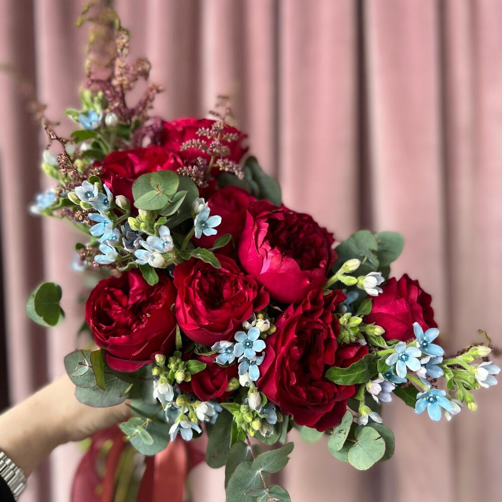 Роза пионовидная – 9 шт.Астильба – 4 шт.Оксипеталум – 11 шт.Эвкалипт – 7 шт.