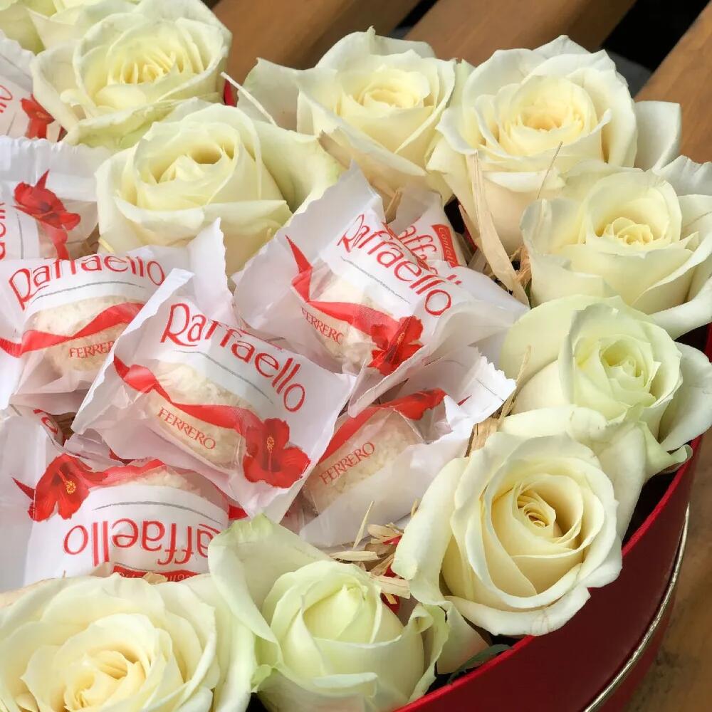 Композиция в виде сердца из белых роз и конфет рафаэло.