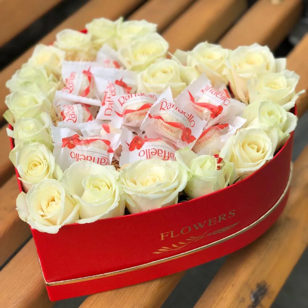 Роза белая – 19 шт. конфеты раффаэлло – 15 шт. Коробка в виде сердца – 1 шт.