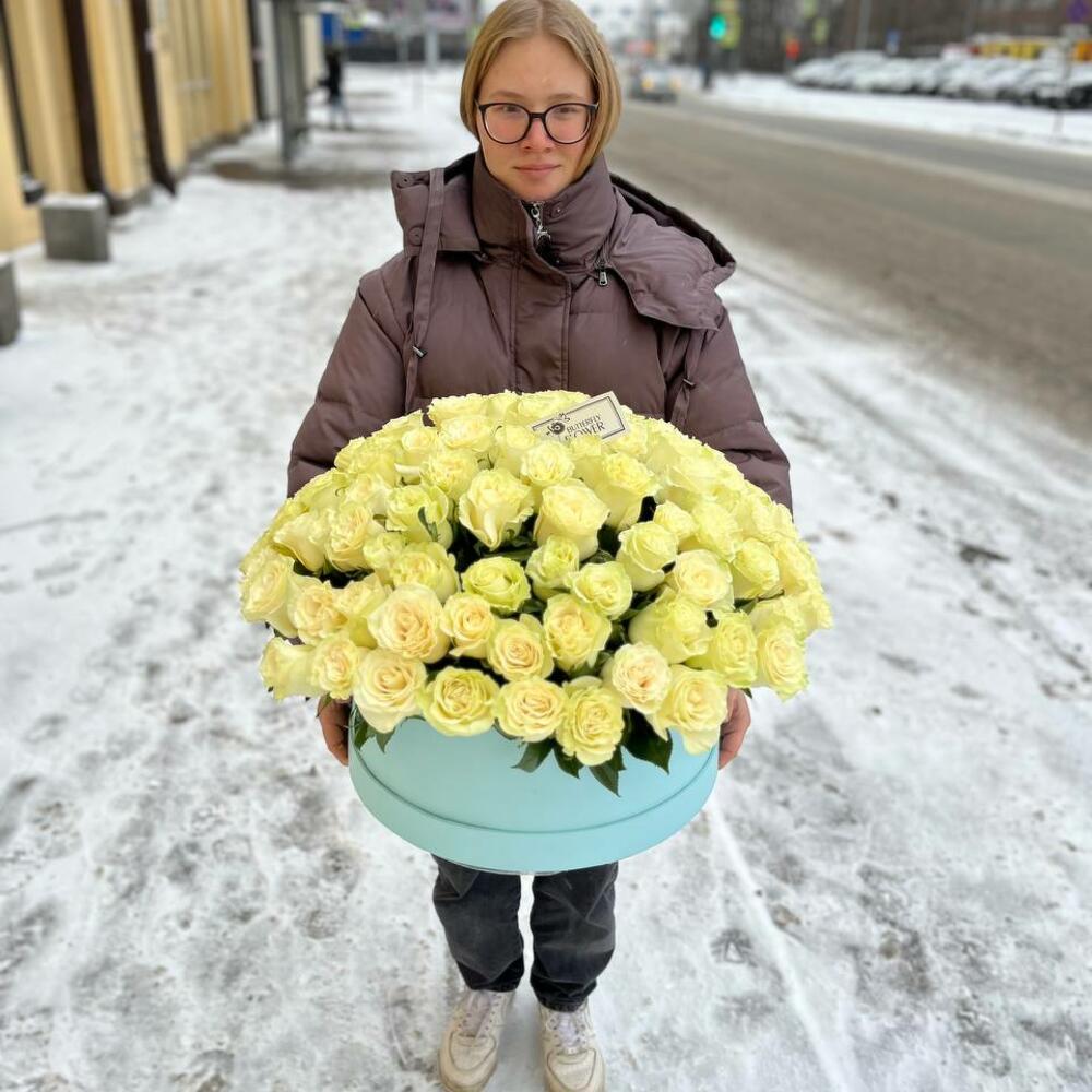 Большой букет из 101 белой розы в шляпной коробке “101 снежинка”