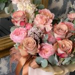 Роза Капучино – 5 шт.Маттиола – 2 шт.Роза кустовая пионовидная джульетта – 1 шт.Озотамнус – 2 шт.Диантус – 3 шт.Эвкалипт – 3 шт.Оазис флористический – 1 шт.бумага дизайнерская – 1 шт.Коробка шляпная – 1 шт.Лента атласная – 2 шт.