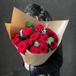 Эвкалипт – 3 шт.Упаковка дизайнерская – 2 шт.Роза красная 50 см – 15 шт.