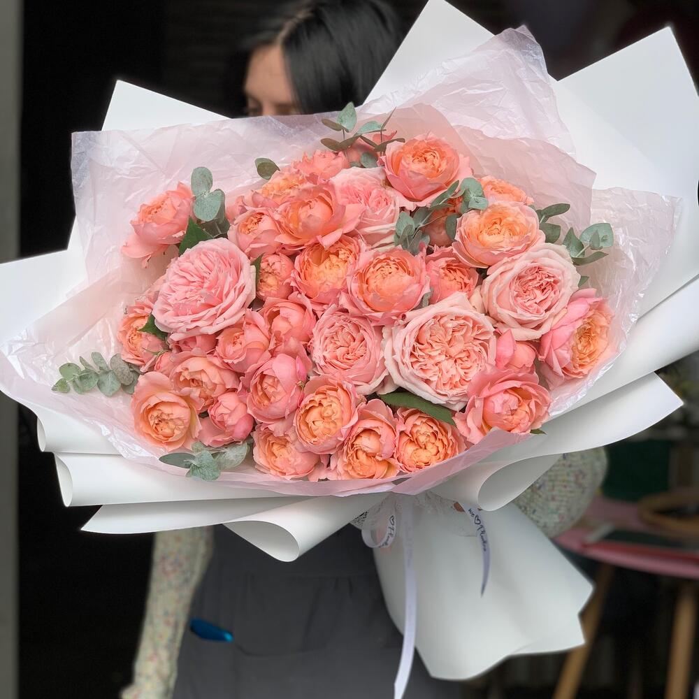 Кустовая роза – 7 шт.Роза – 5 шт.зелень декоративная – 5 шт.Упаковка дизайнерская – 5 шт.
