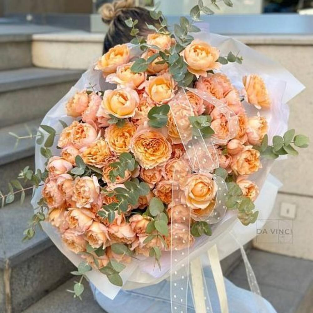 Букет из пионовидных спрей роз и эвкалипта в стильном оформлении. Заказав букет с доставкой от Da Vinci, Вы скрасите день обладательницы букета и подарите ей незабываемые эмоции.