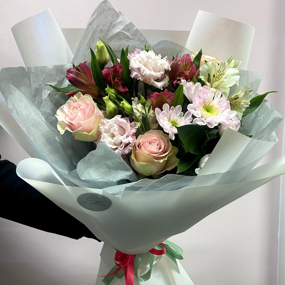 Альстромерия – 2 шт. Хризантема кустовая – 1 шт. Эустома – 2 шт. Роза Голландская – 3 шт. Упаковка дизайнерская – 1 шт.