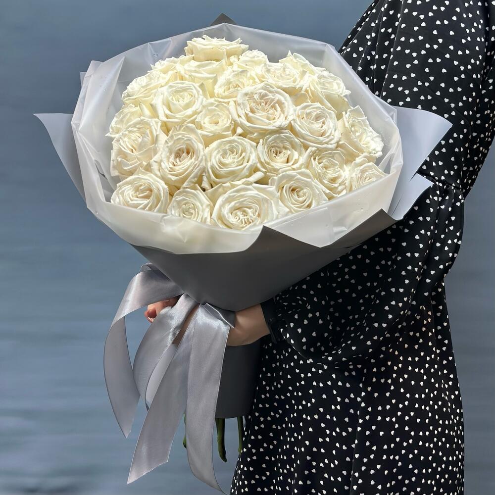 роза пионовидная плая бланка – 25 шт.Тишью белое – 1 шт.Дизайнерская упаковка – 1 шт.Лента атласная – 2 шт.