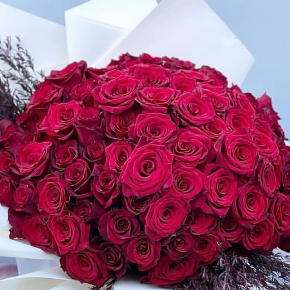Алая роза – 51 шт.Упаковка дизайнерская – 1 шт.Лента атласная – 2 шт.Открытка – 1 шт.инструкция по уходу за цветами – 1 шт.хорошее настроение – 100 шт.коробка переноска – 1 шт.Кризал – 1 шт.Сухоцвет – 10 шт.
