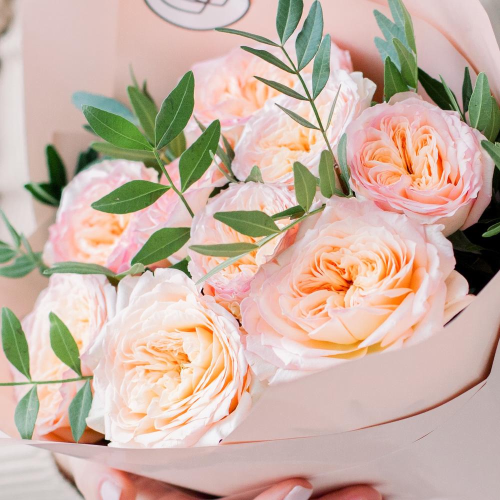Букет из 9 персиковых пионовидных роз Flash Back 40 см c фисташкой в кремовой пленке