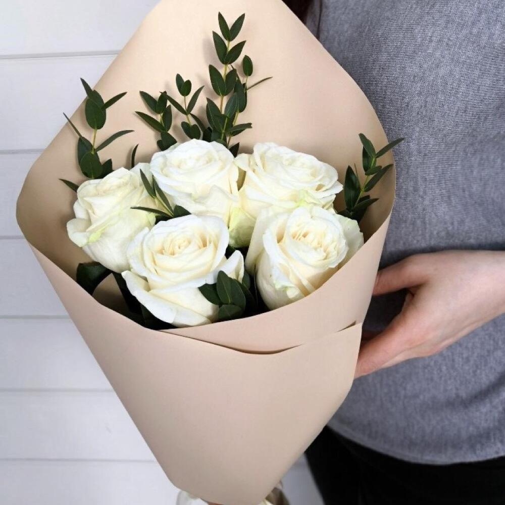 розы белые – 5 шт.зелень декоративная – 2 шт.Упаковка дизайнерская – 2 шт.Лента атласная – 1 шт.работа флориста – 1 шт.