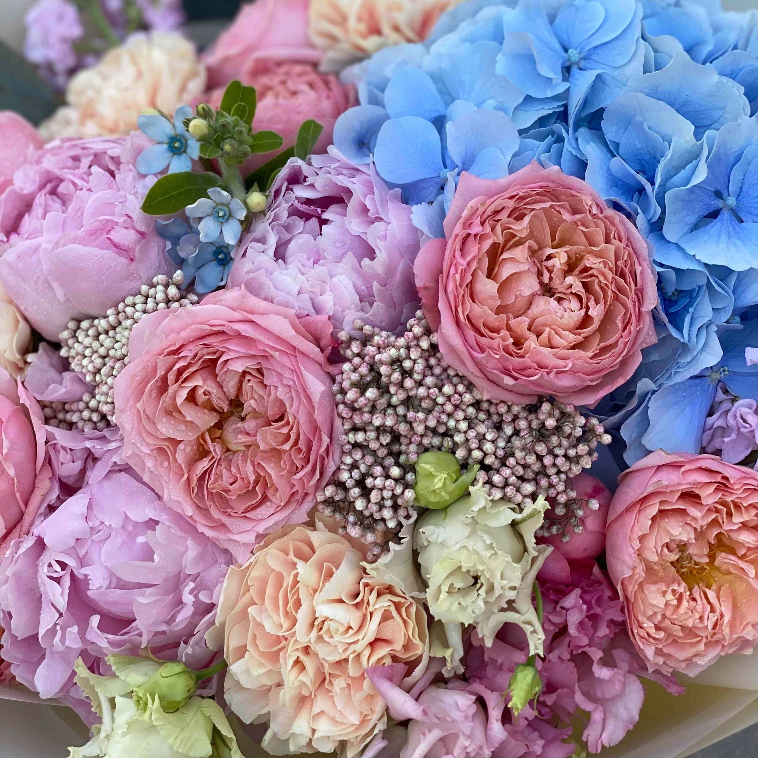 Букет с пионами ,орхидея ,Роза в дизайнерском оформлении
