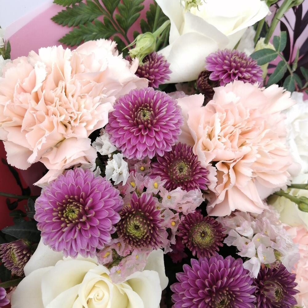 Букет из хризантем, роз, лизиантуса "Классика"