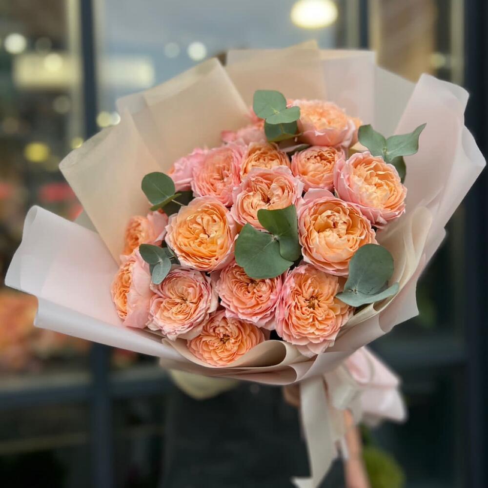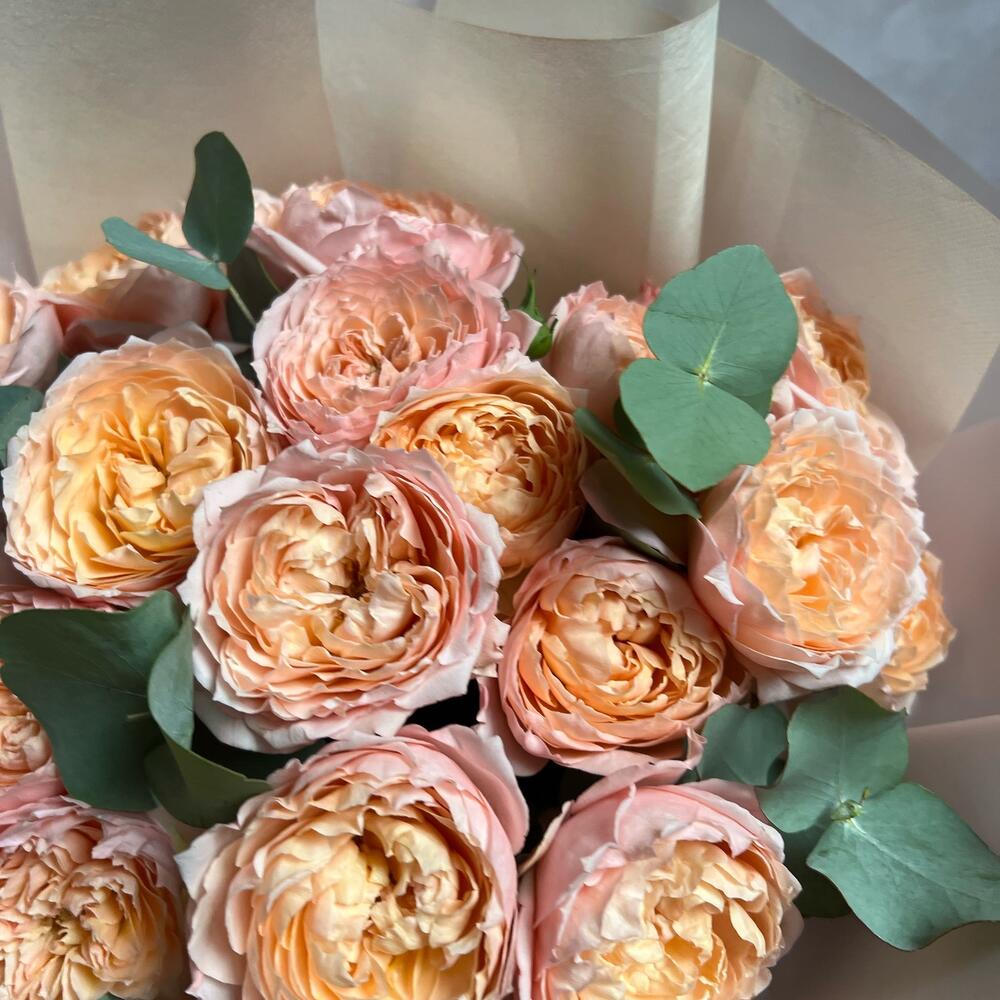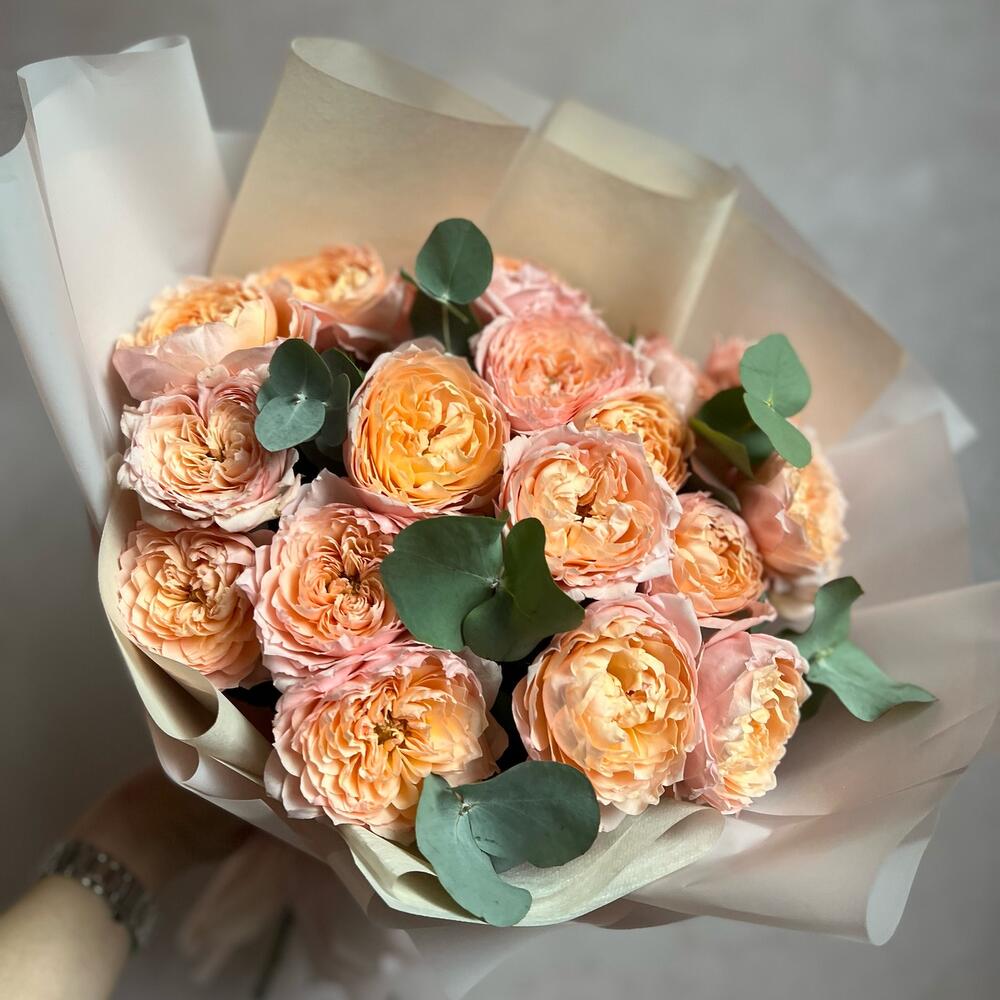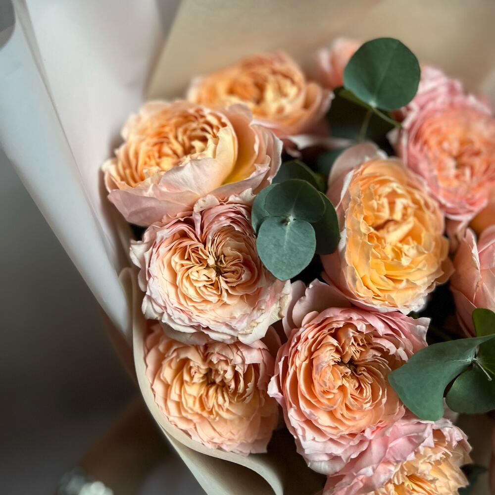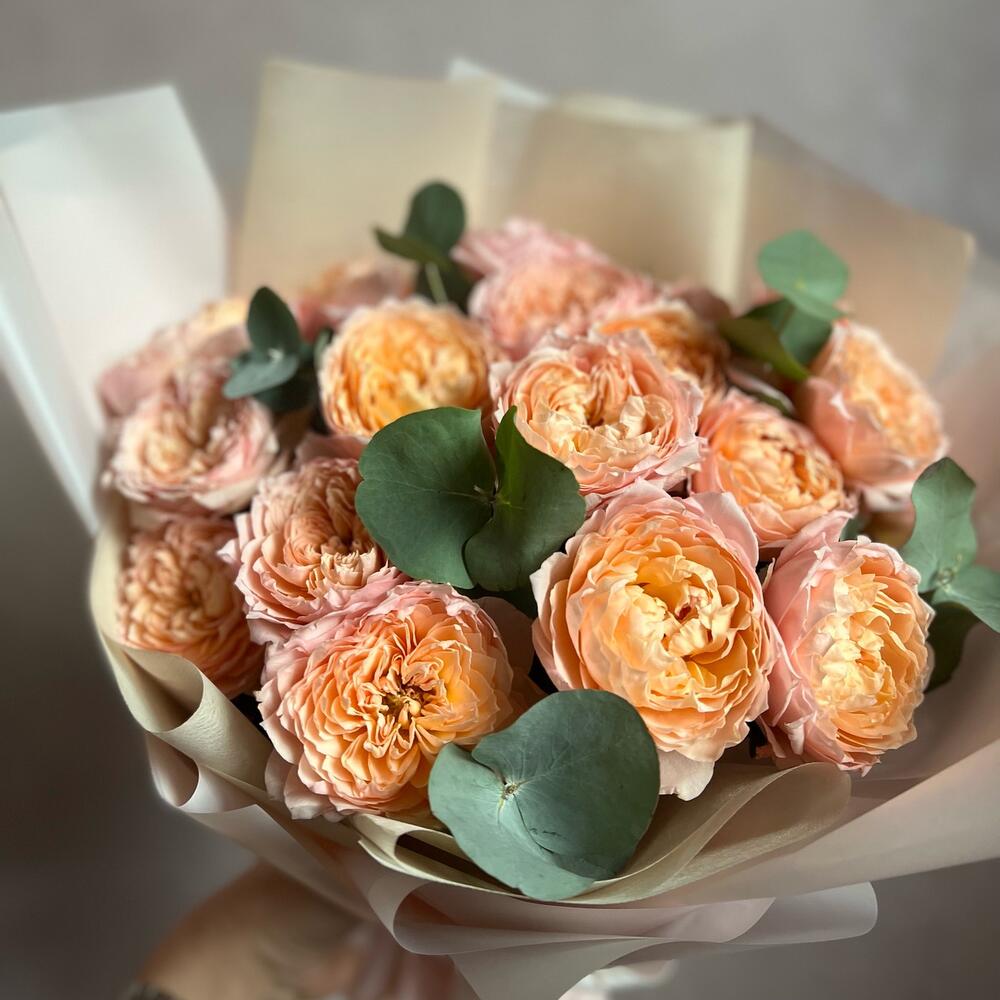 Букет из кустовой пионовидной розы Джульетта и эвкалипт