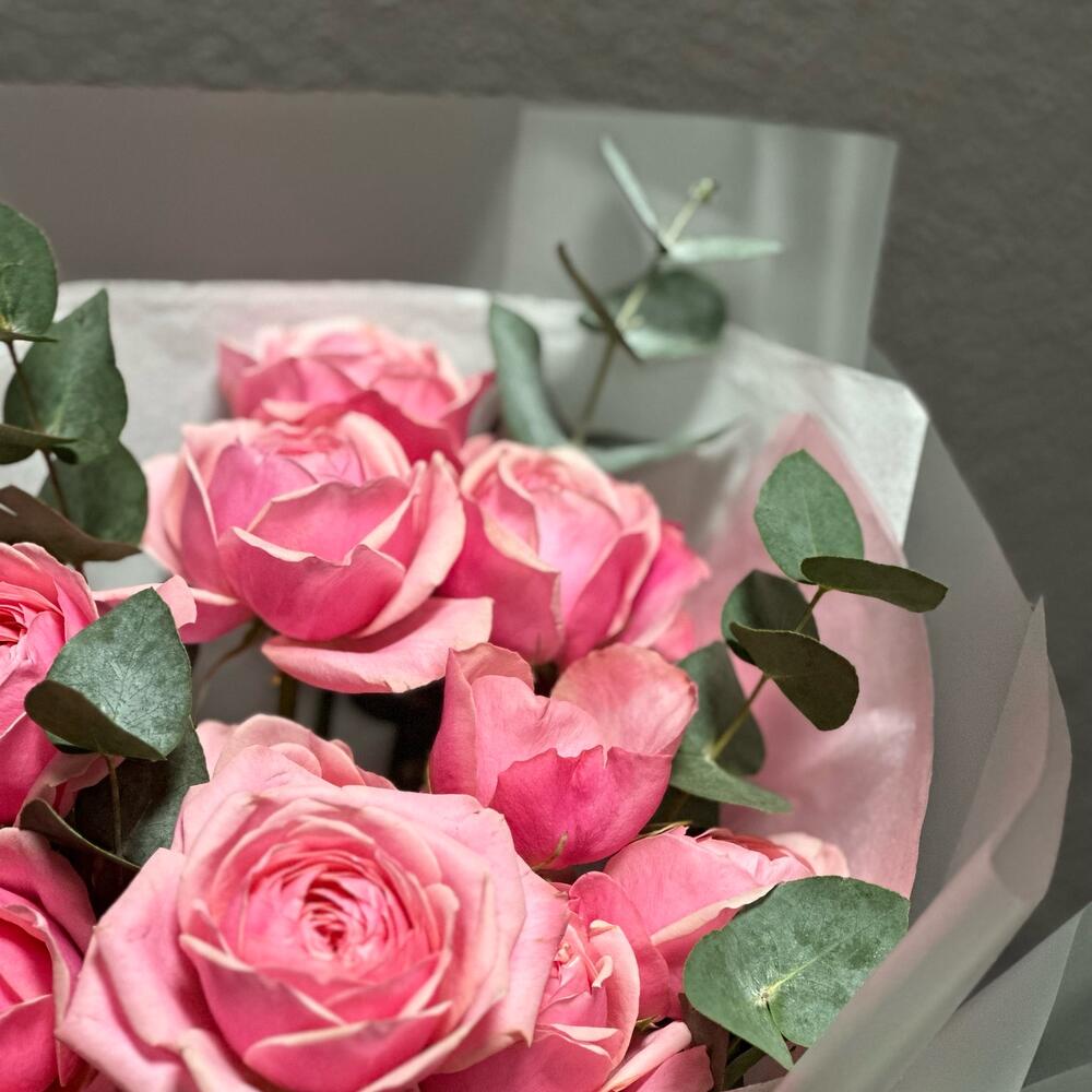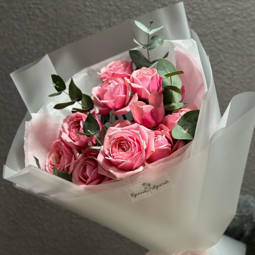 Эвкалипт – 1 шт.Лента атласная – 1 шт.Тишью – 2 шт.Пленка – 2 шт.Роза кустовая пионовидная – 3 шт.