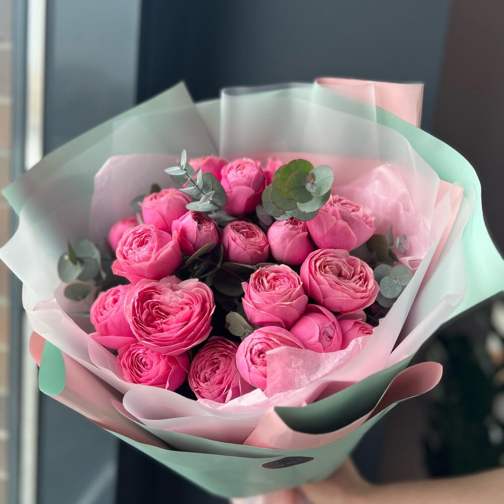 Букет из кустовой розовой пионовидной розы и эвкалипт