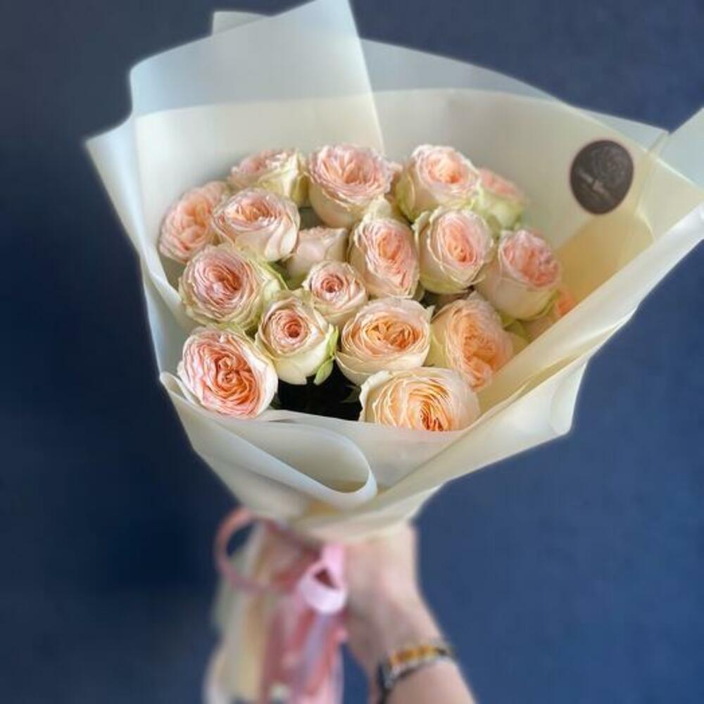 Кустовая пионовидная роза – 5 шт.Дизайнерская упаковка – 1 шт.Атласная лента – 1 шт.