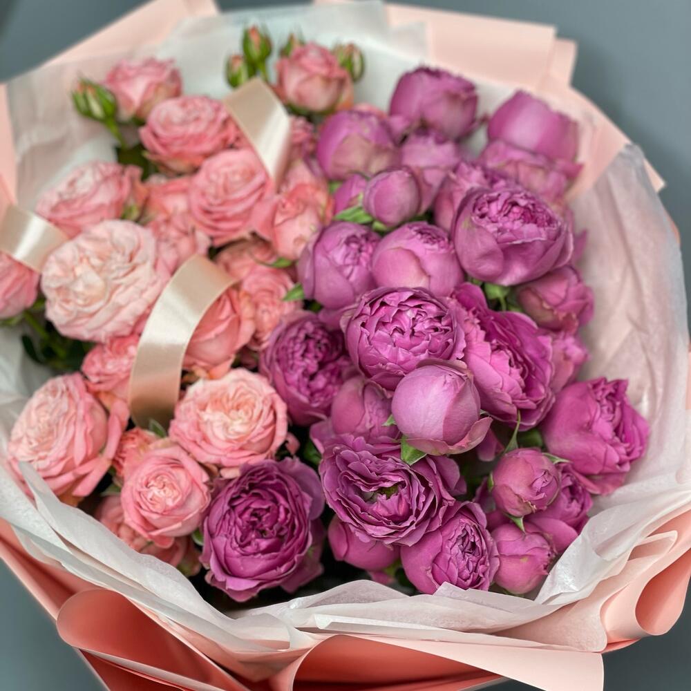 Лента – 2 шт.Роза кустовая пионовидная – 9 шт.Оформление матовая пленка – 7 шт.аквапак с водой – 1 шт.оформление тишью – 4 шт.
