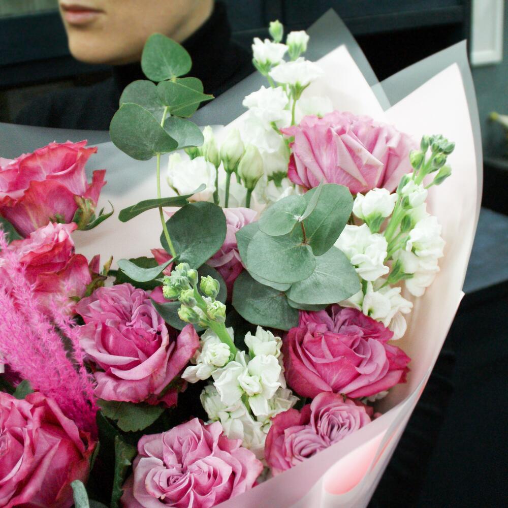 Лизиантус – 3 шт.Маттиола – 3 шт.Эвкалипт – 3 шт.Роза пионовидная – 9 шт.Дизайнерская упаковка – 1 шт.мискантус – 2 шт.
