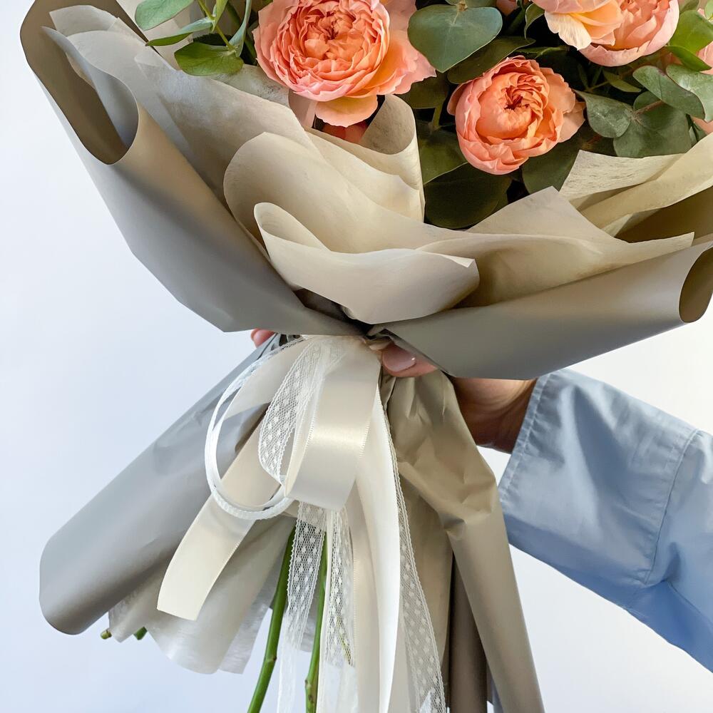 Лента – 1 шт.Эвкалипт – 2 шт.Упаковка – 1 шт.Роза пионовидная – 5 шт.