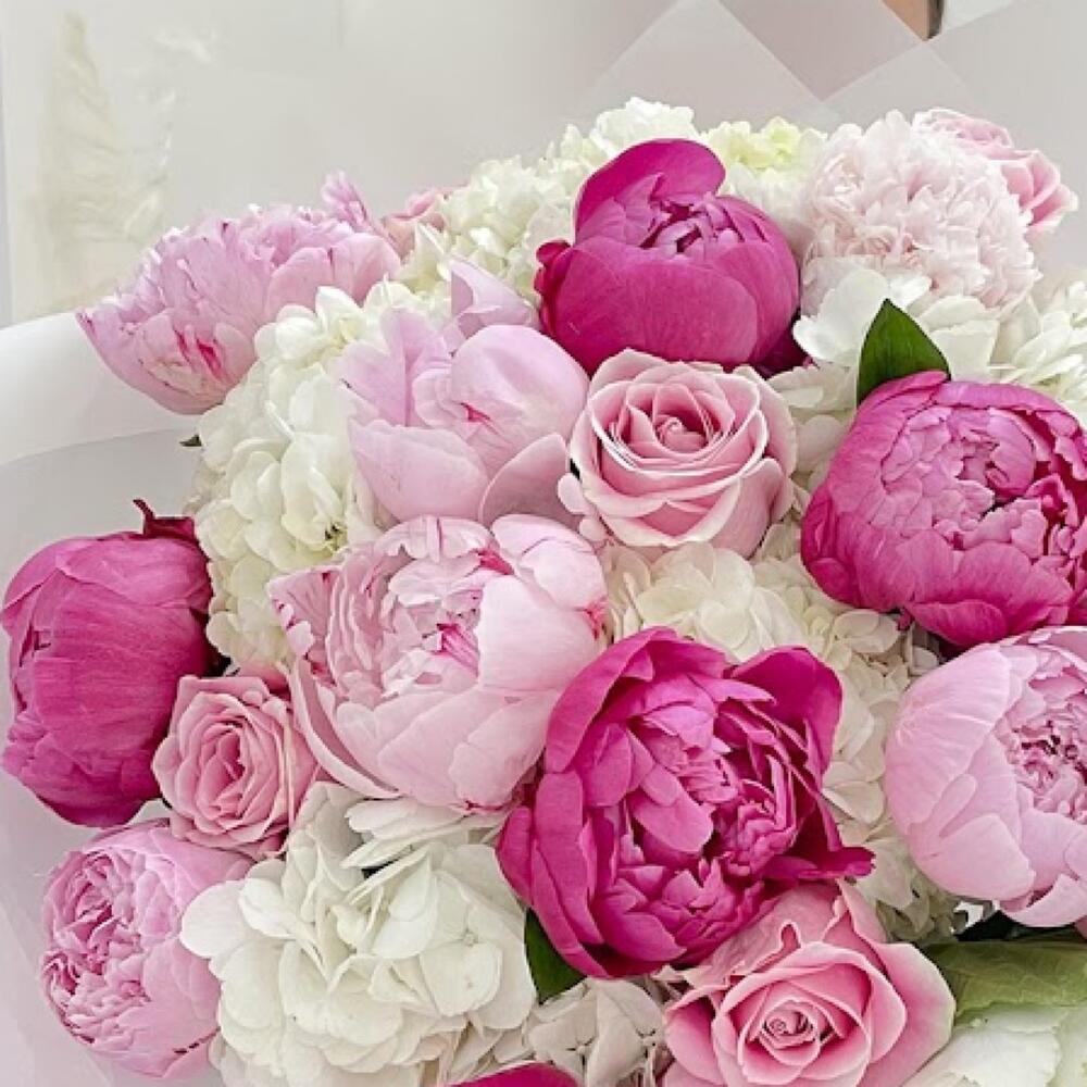 пионы ярко розового цвета – 5 шт.пионы нежно розовые – 6 шт.Гортензия белая – 9 шт.Роза розовая – 7 шт.Упаковка дизайнерская – 1 шт.Лента атласная – 2 шт.Открыточка с вашими пожеланиями – 1 шт.хорошее настроение – 100 шт.инструкция по уходу за цветами – 1 шт.коробка переноска – 1 шт.Кризал – 1 шт.