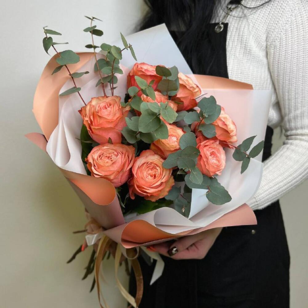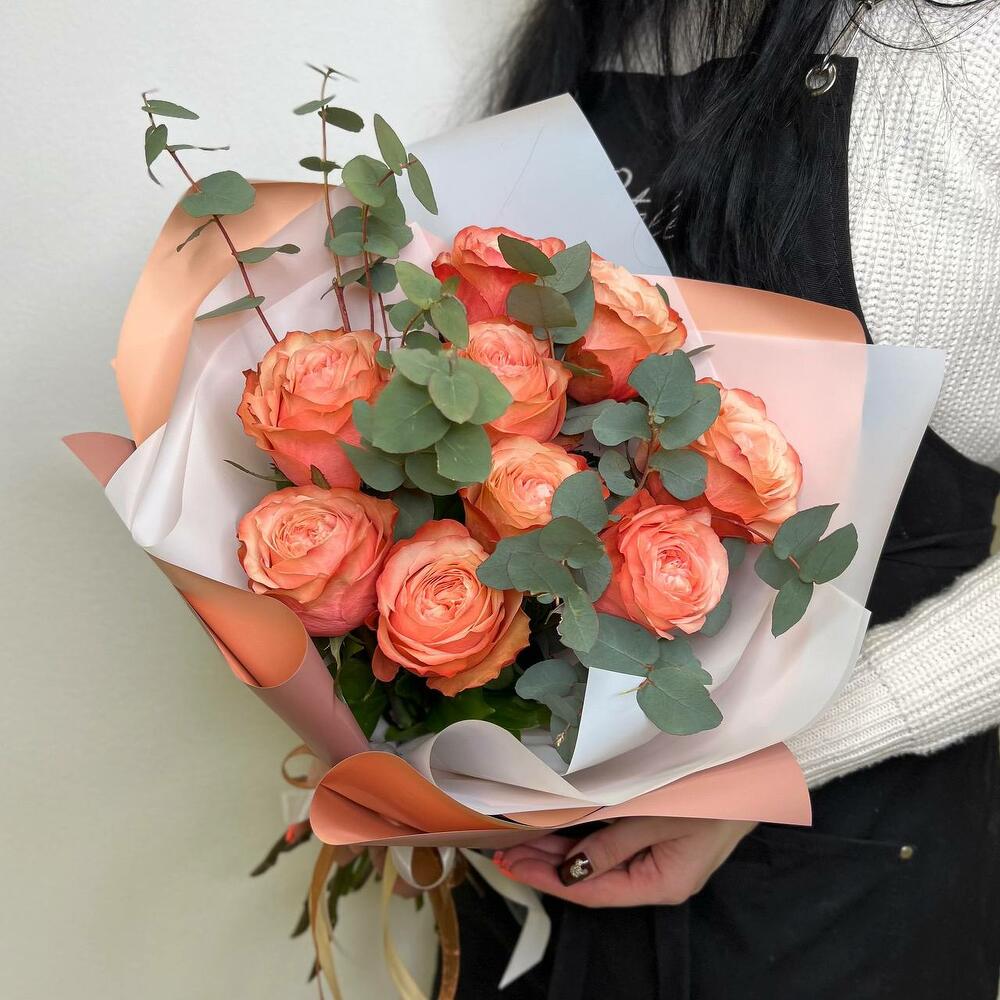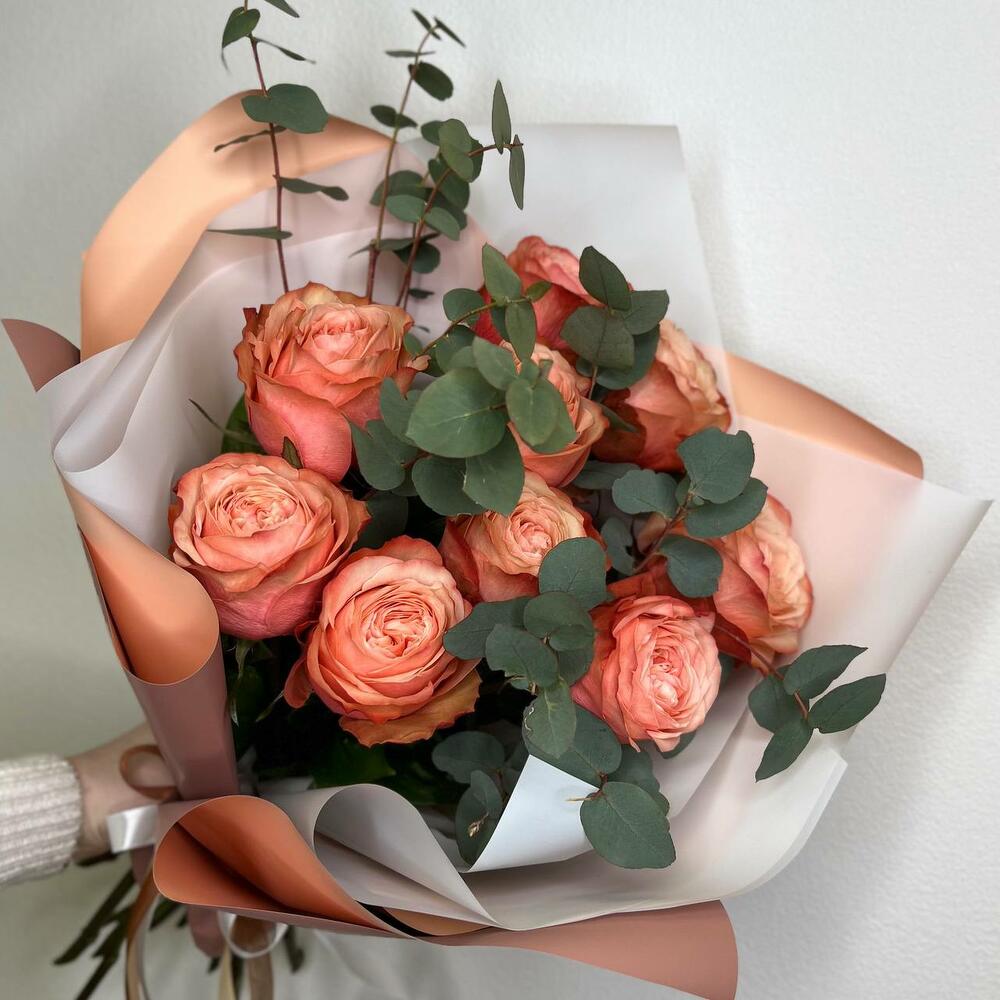 Пионовидная роза одноголовая – 9 шт.Эвкалипт – 3 шт.Рускус – 5 шт.Упаковка дизайнерская – 3 шт.