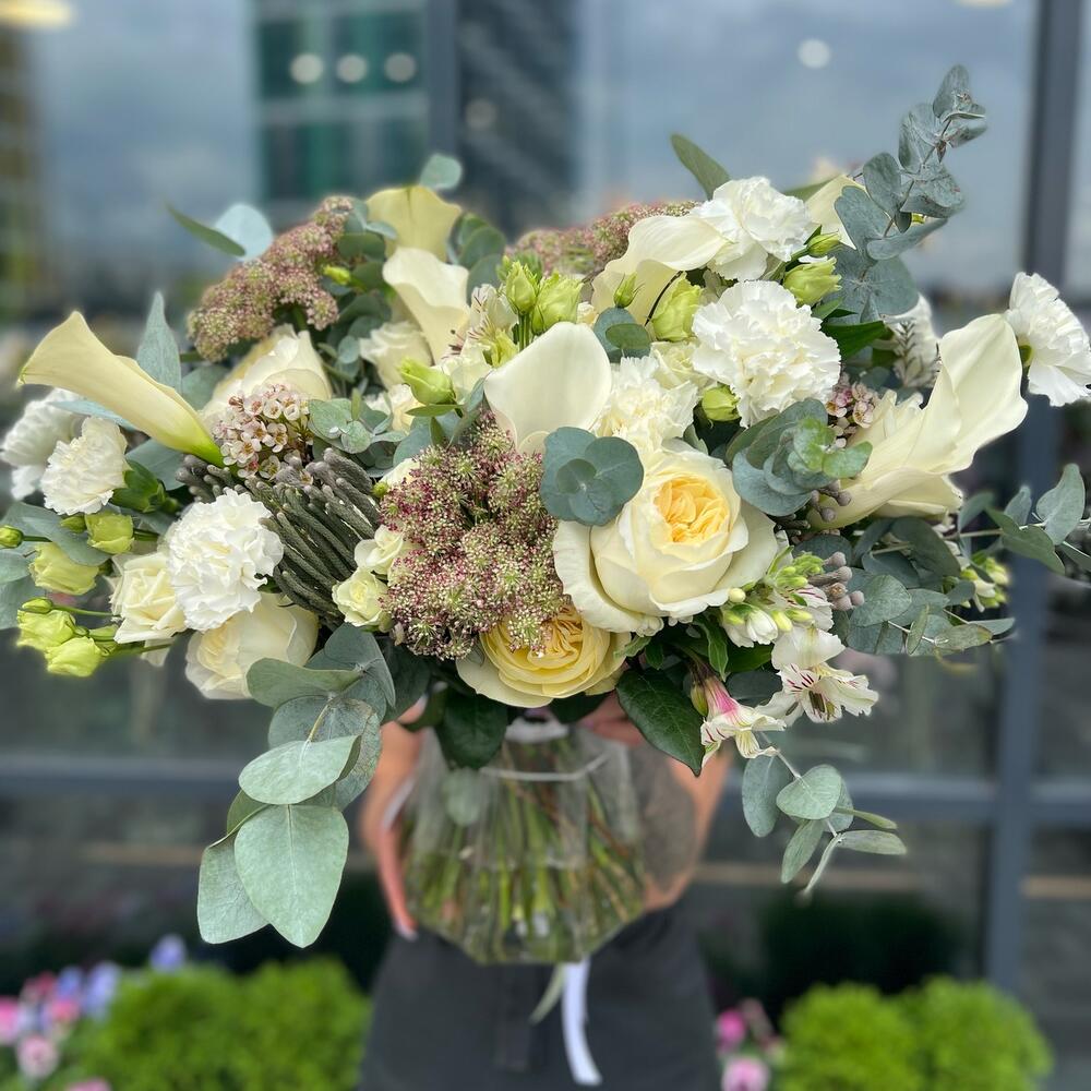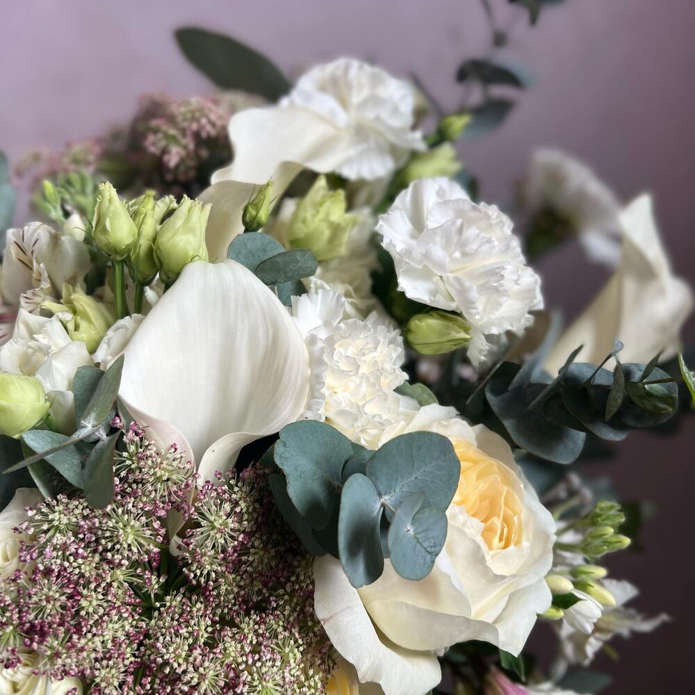 Калла – 8 шт.Роза одноголовая – 6 шт.Пионовидная роза – 7 шт.Амми – 3 шт.Лизиантус – 4 шт.Оксипеталум – 5 шт.Альстромерия – 5 шт.Гвоздика – 13 шт.Бруния – 5 шт.Хамелациум – 6 шт.Эвкалипт – 7 шт.
