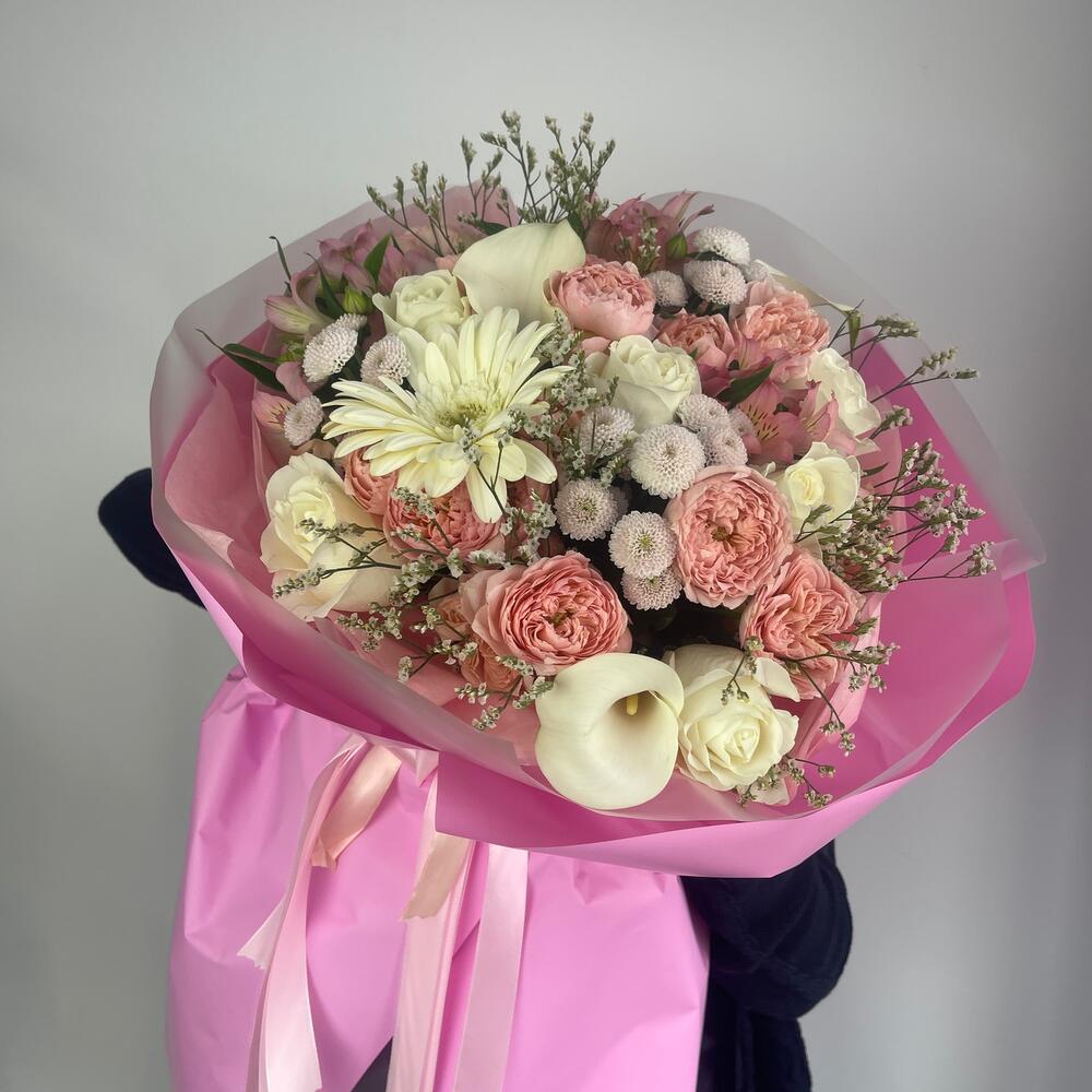 Пленка – 6 шт.каллы белые – 2 шт.Роза белая – 5 шт.джульетта роза пионовидная – 5 шт.Альстромерия – 3 шт.Сантини – 3 шт.Лимониум – 2 шт.Гербера – 1 шт.Салал пучок – 1 шт.