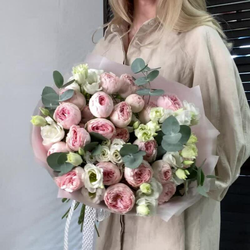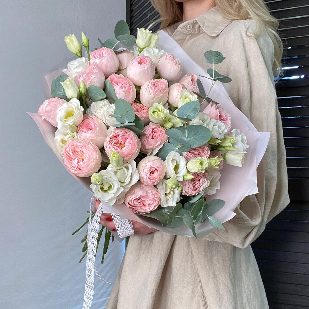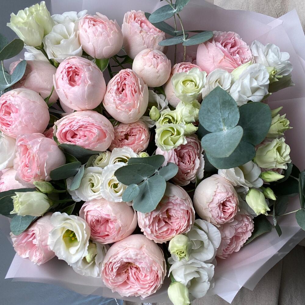 Букет из пионовидных роз мэнсфилд парк с эустомой и эвкалиптом