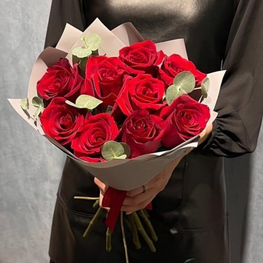 Эвкалипт – 3 шт.Лента атласная – 2 шт.Упаковка дизайнерская – 2 шт.бордовые эквадорских розы – 9 шт.