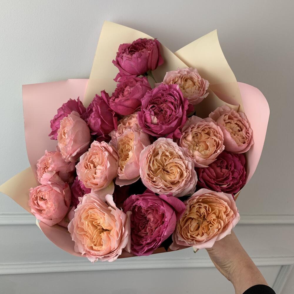 джульетта кустовая роза пионовидная – 7 шт.Пленка дизайнерская – 1 шт.Лента атласная – 1 шт.